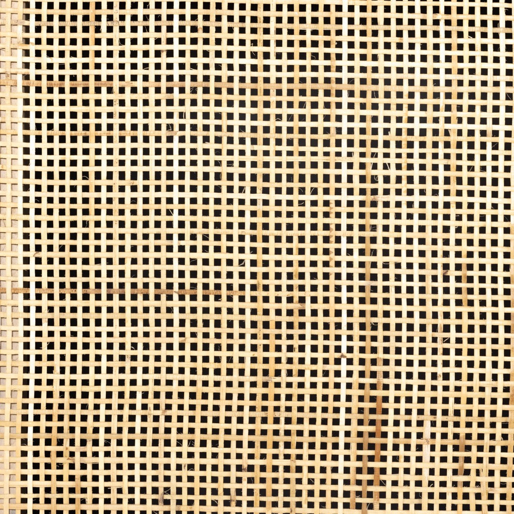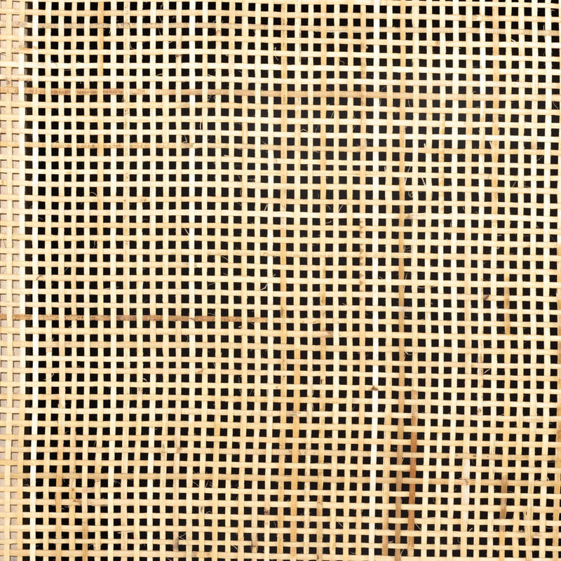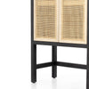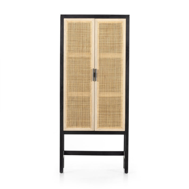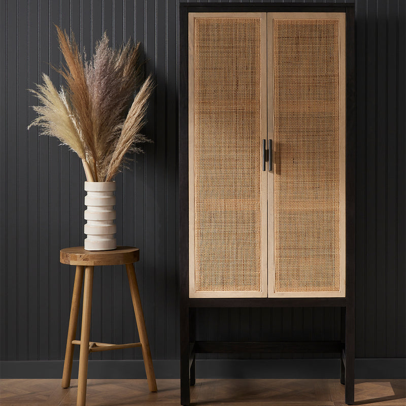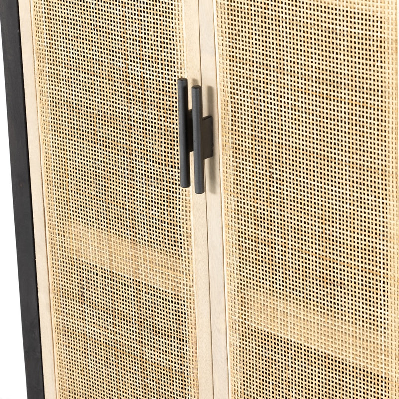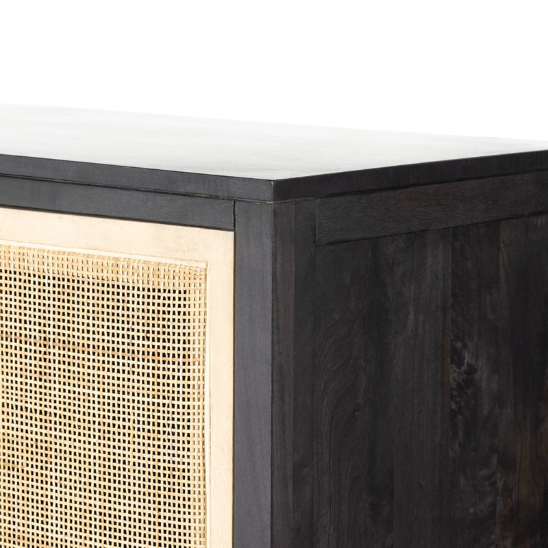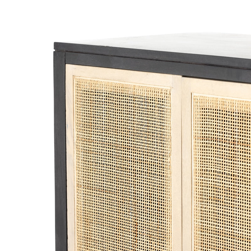 Two-tone contrast with a textural twist. Washed black acacia frames woven cane doors, which open to reveal spacious interior storage. A simple Parsons-style base keeps things feeling open and airy.
