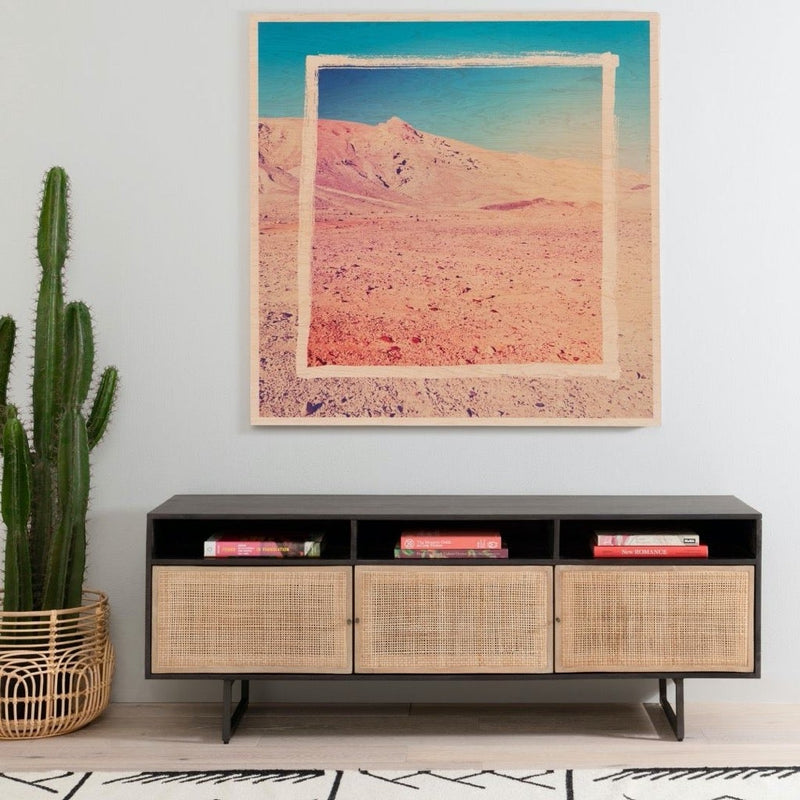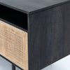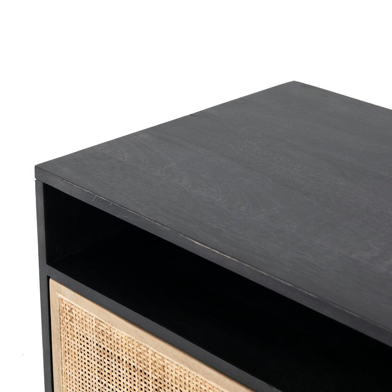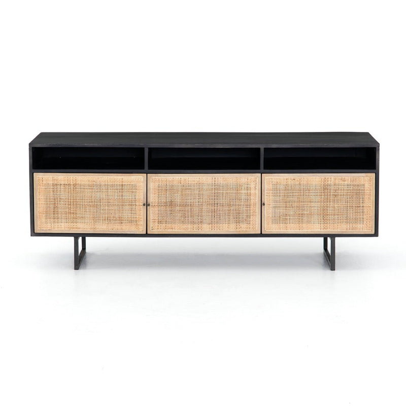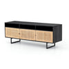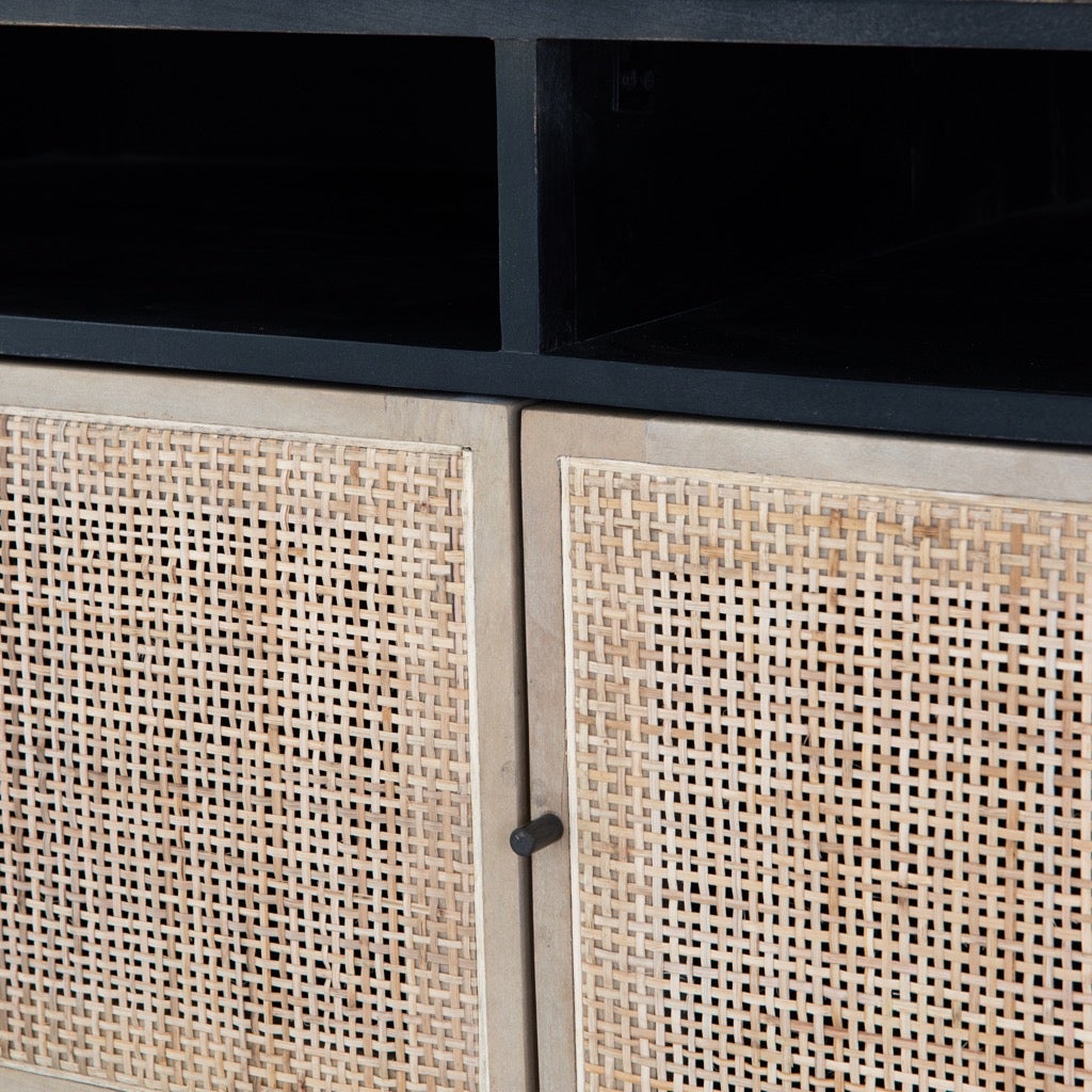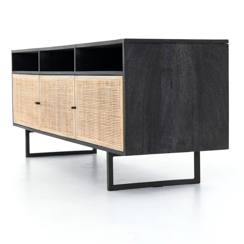 Mid-century-inspired style with an organic twist. Surrounded by black mango casing, light cane weaves for a fresh look with natural depth. Angular gunmetal-finished iron legs offer an intriguing contrast of texture and tone. Shelving and posterior cord management for modern media storage.
