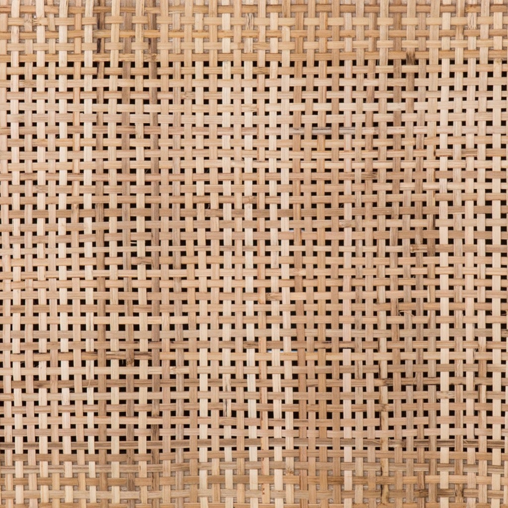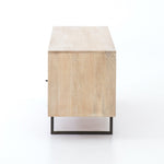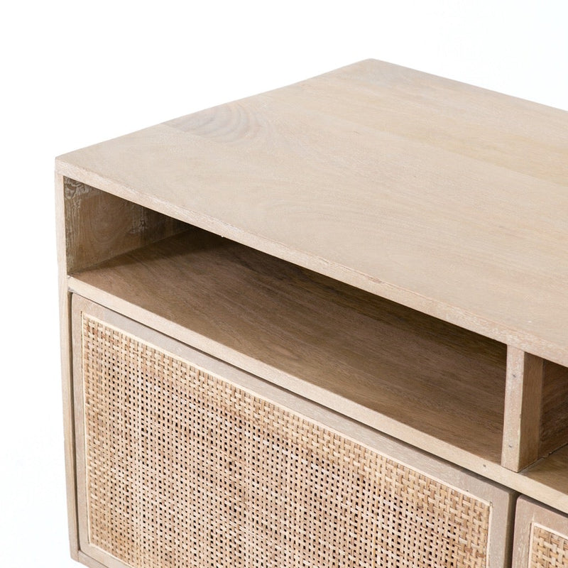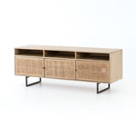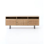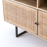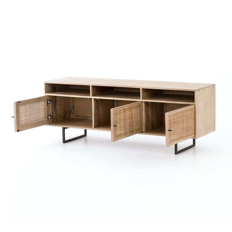 Mid-century-inspired style with an organic twist. Surrounded by mango casing, light cane weaves for a fresh look with natural depth. Angular gunmetal-finished iron legs offer an intriguing contrast of texture and tone. Shelving and posterior cord management for modern media storage.