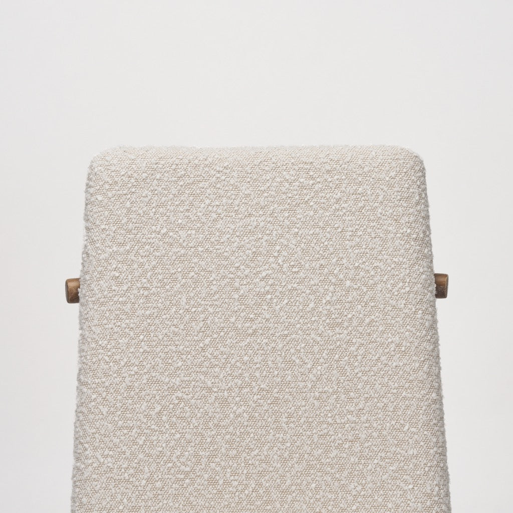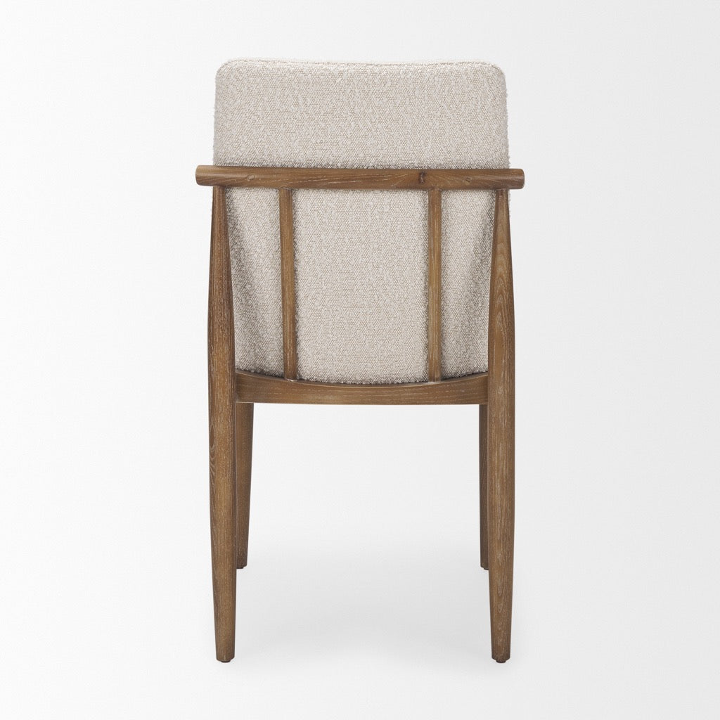 A coastal-inspired dining room chair, stylishly designed in solid wood with a bouclé fabric and whitewash finish.