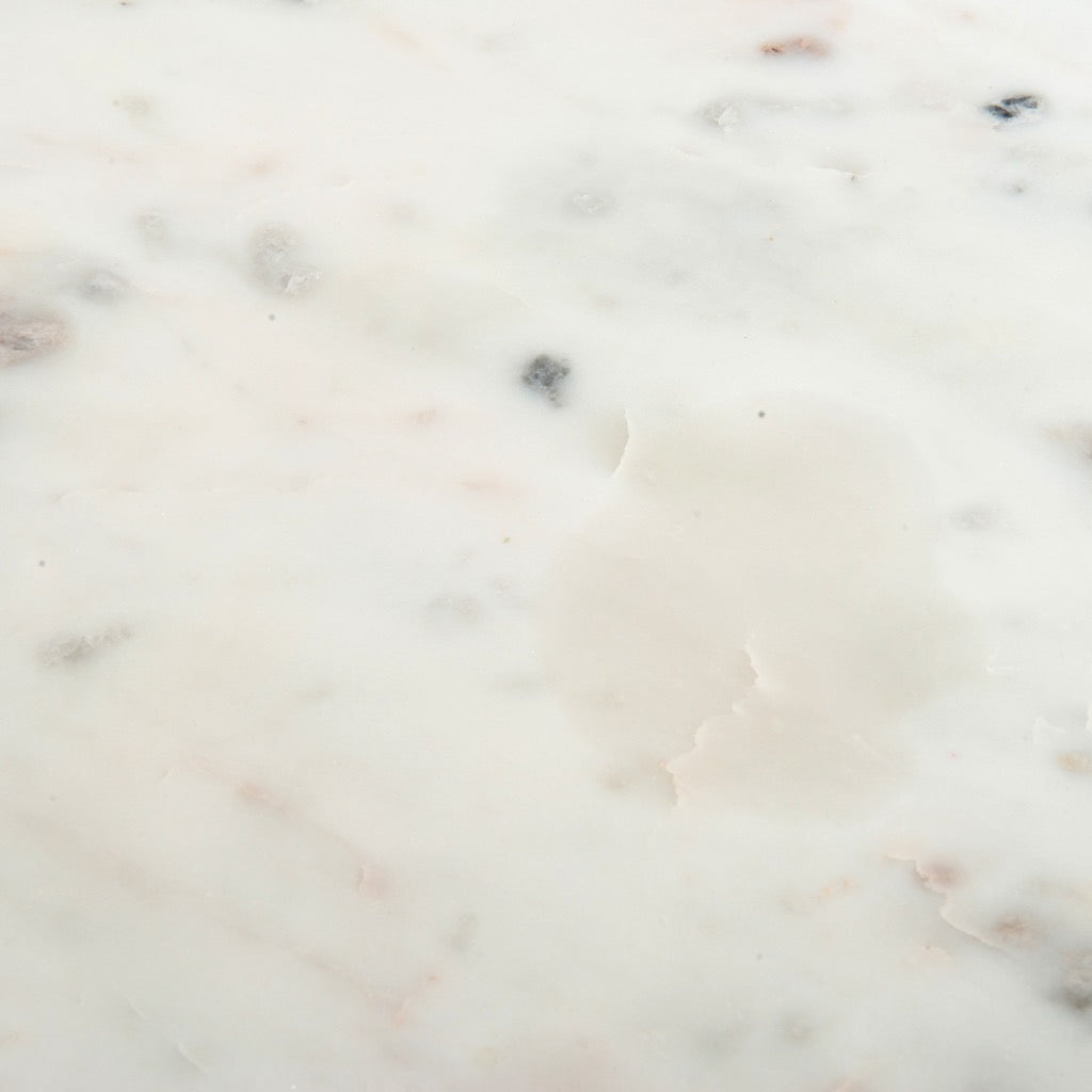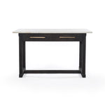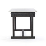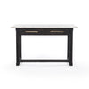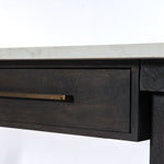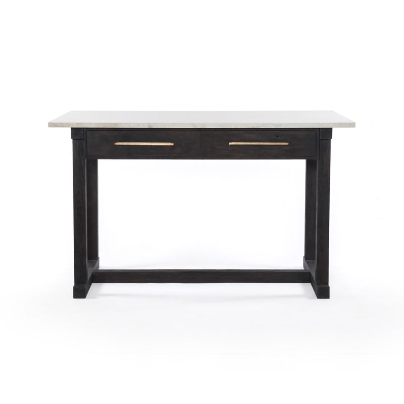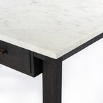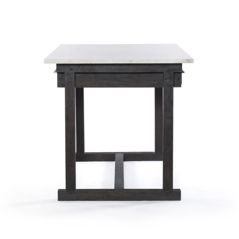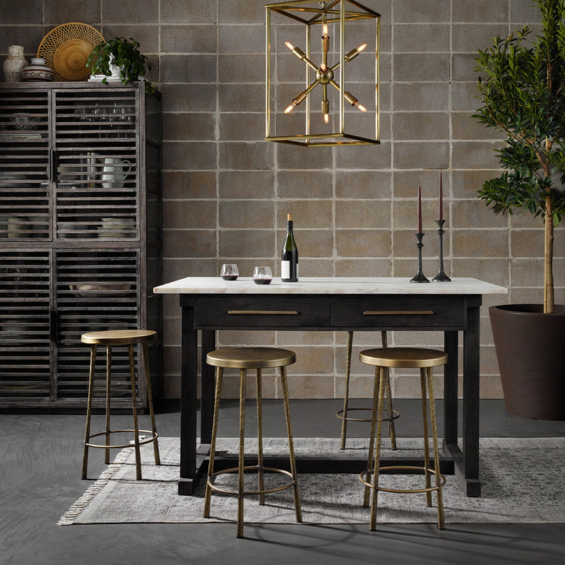 Sophisticated material mixes bring a classic French feel to the contemporary kitchen. Coal-finished mango wood supports a top of polished white marble for a clean look with alluring contrast, plus brass drawer pulls for vintage vibes.