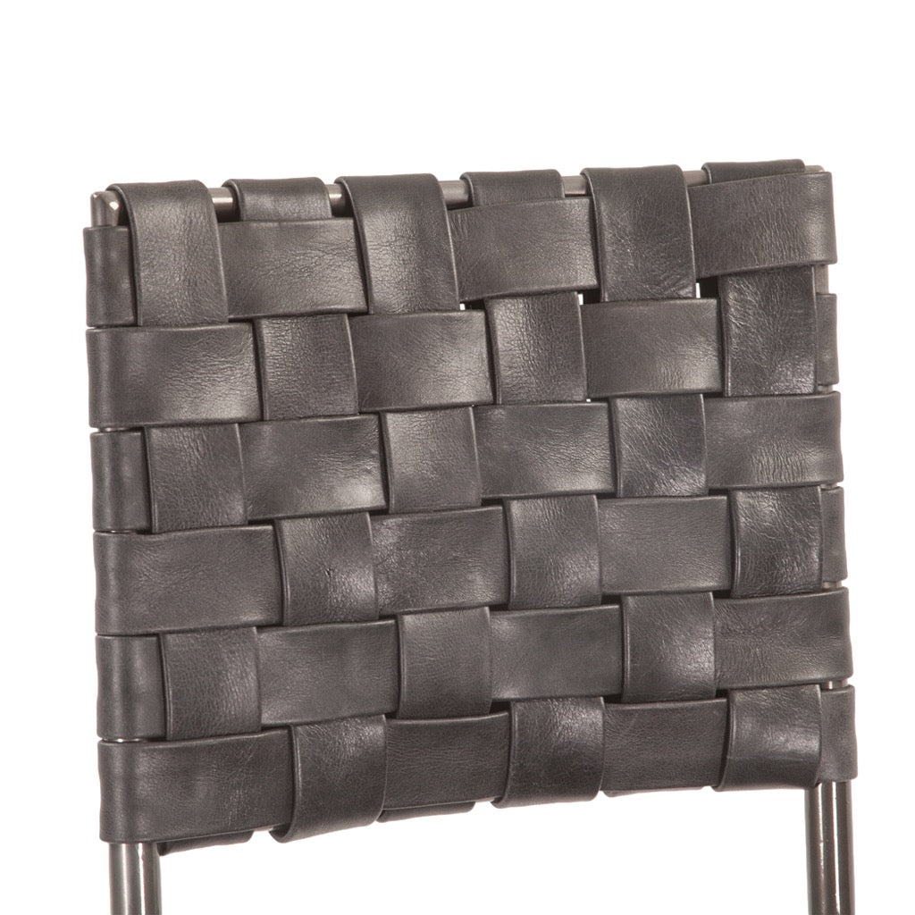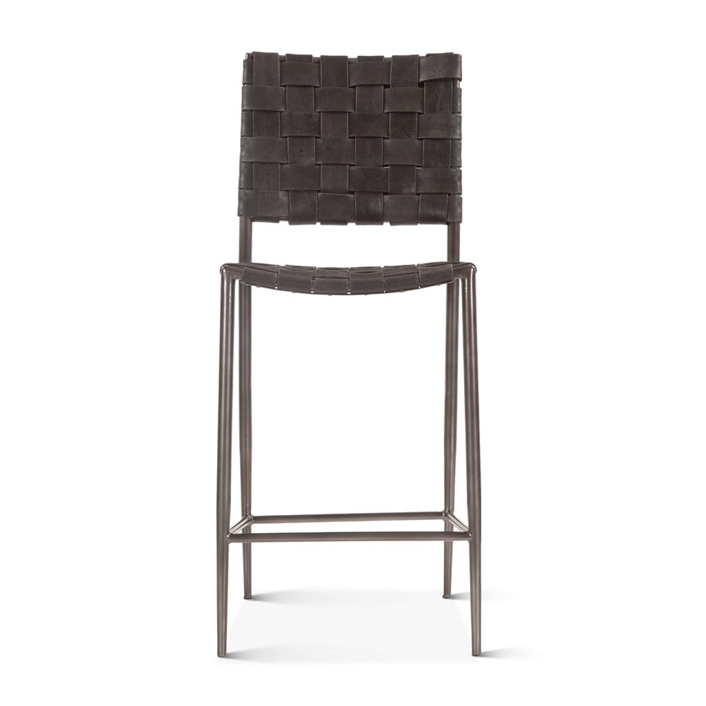 The Copenhagen Counter Chair features a seat and back crafted from woven Black Buffalo Leather, offering a textured, natural finish. The sturdy iron legs have a sleek pewter finish, adding a modern touch. This chair seamlessly blends contemporary design with artisanal craftsmanship, making it a standout piece for any space.