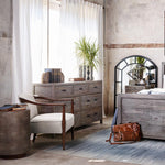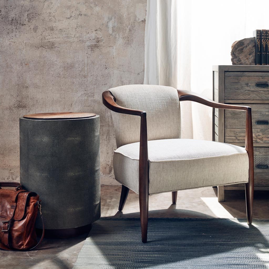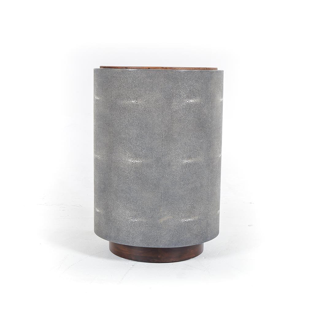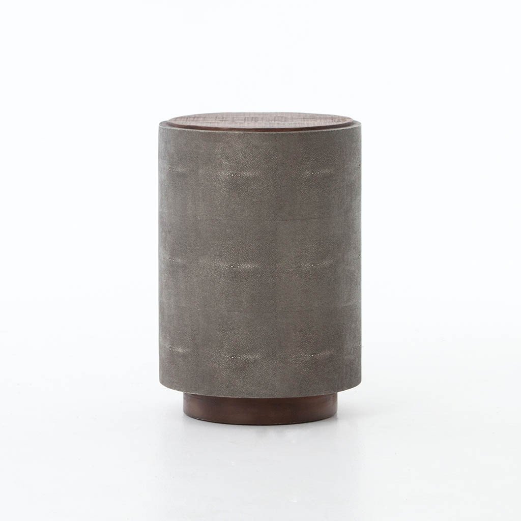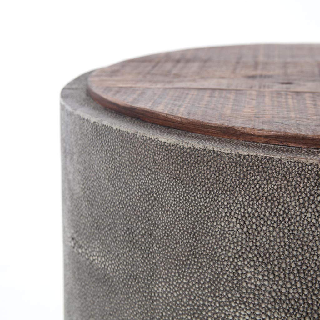 Mixed materials and the simplest of shapes are sized to make a perfect side table. Reclaimed Peroba wood is supported by a textural faux shagreen base in soft grey. Crosby Side Table.