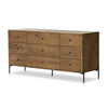Midcentury lines and ample storage blend style and practicality in this amber oak dresser. Gunmetal iron knobs are subtle and clean. This item complies with the STURDY Act.