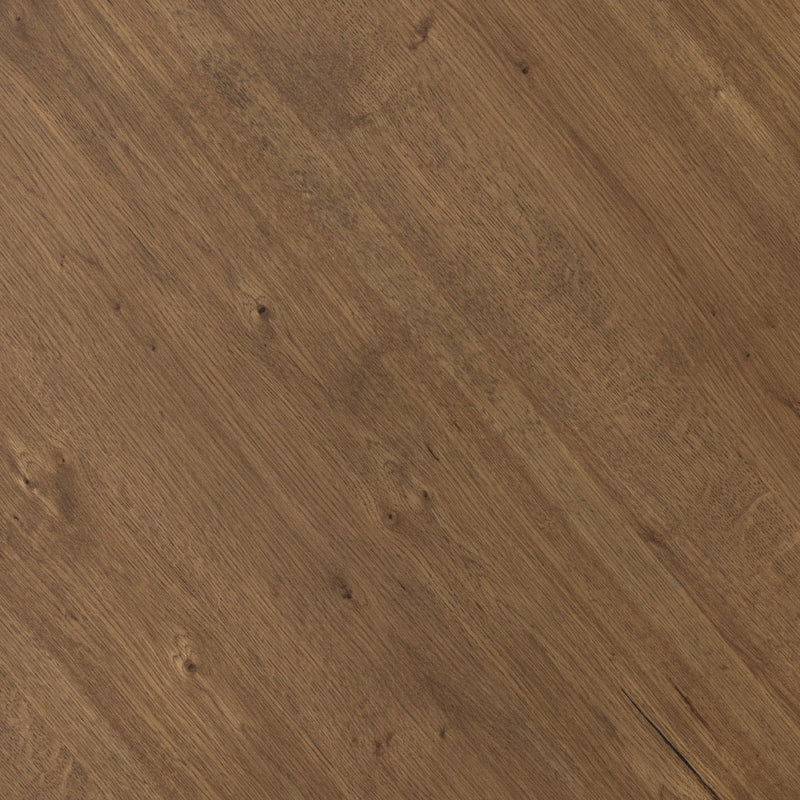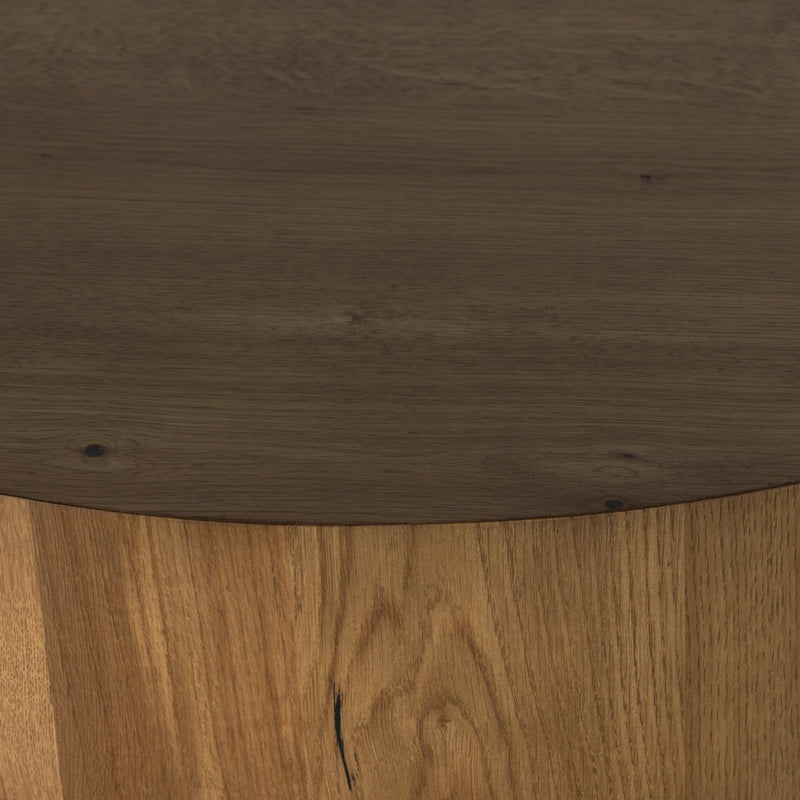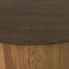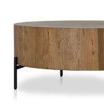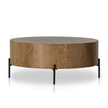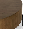 A slight cradle base of gunmetal-finished iron supports a beautifully rounded coffee table shaped from thick oak veneer. For a rich, one-of-a-kind look, black resin fills woods' natural cracks and graining. A subtle variance of resin placement and amount is to be expected, and reflective of materials' character-rich roots.