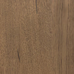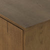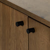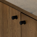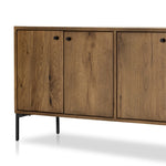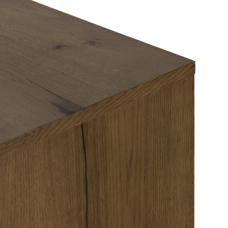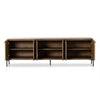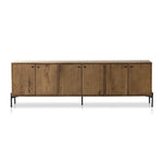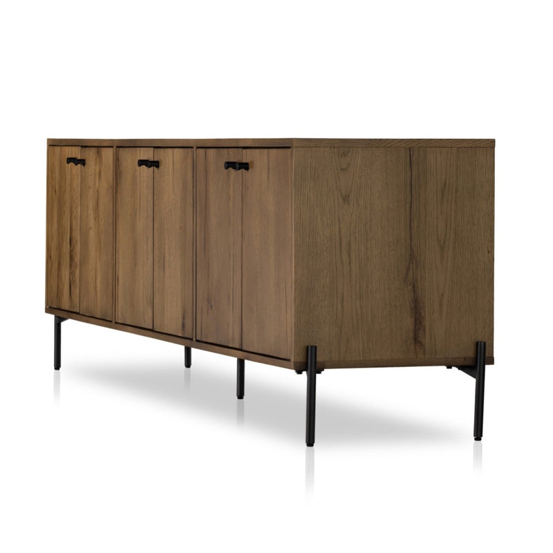 Framed by slim iron finished in a dark gunmetal, amber oak and contrasting resin form a modern media console.