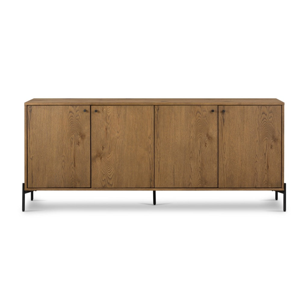 Midcentury lines and ample storage blend style and practicality in this amber oak sideboard. Gunmetal iron knobs are subtle and clean, while the piece's coordinating legs cradle the exterior cabinets and provide architectural interest.