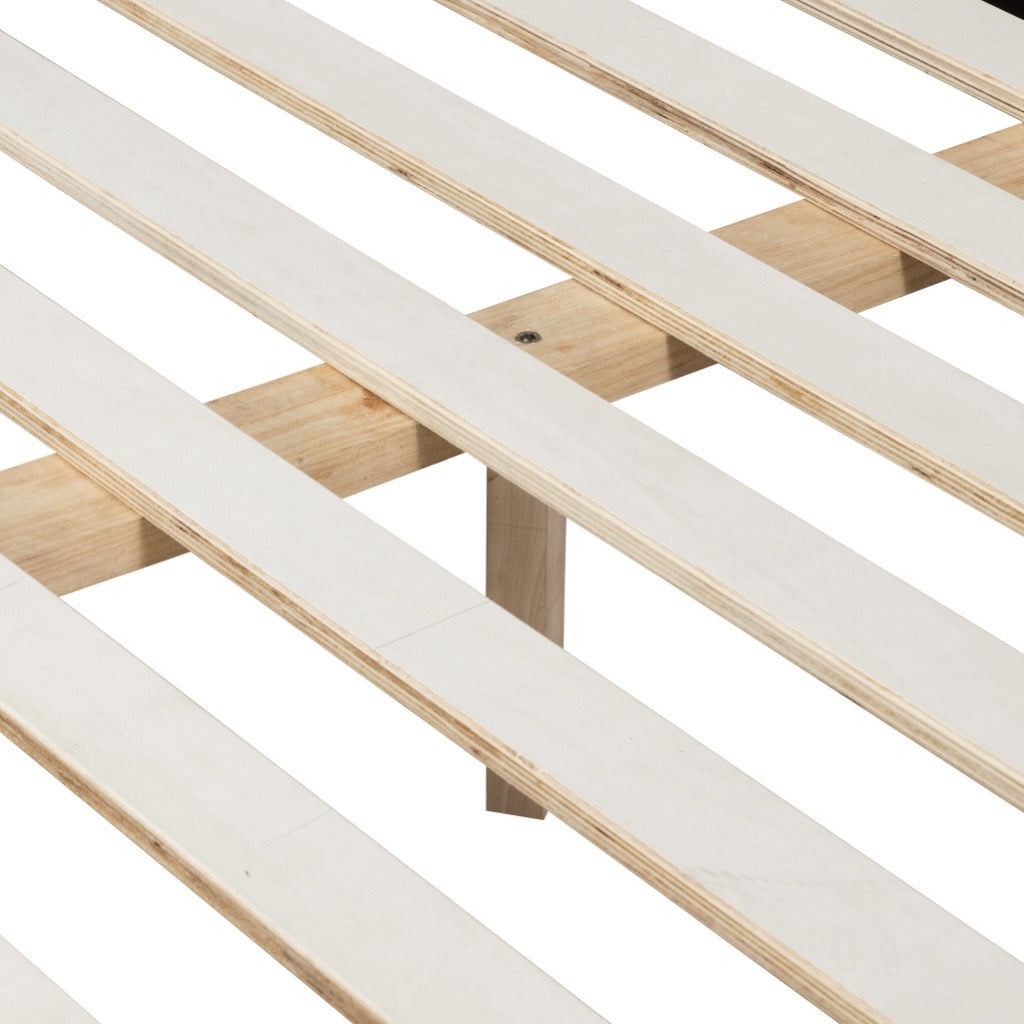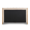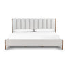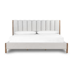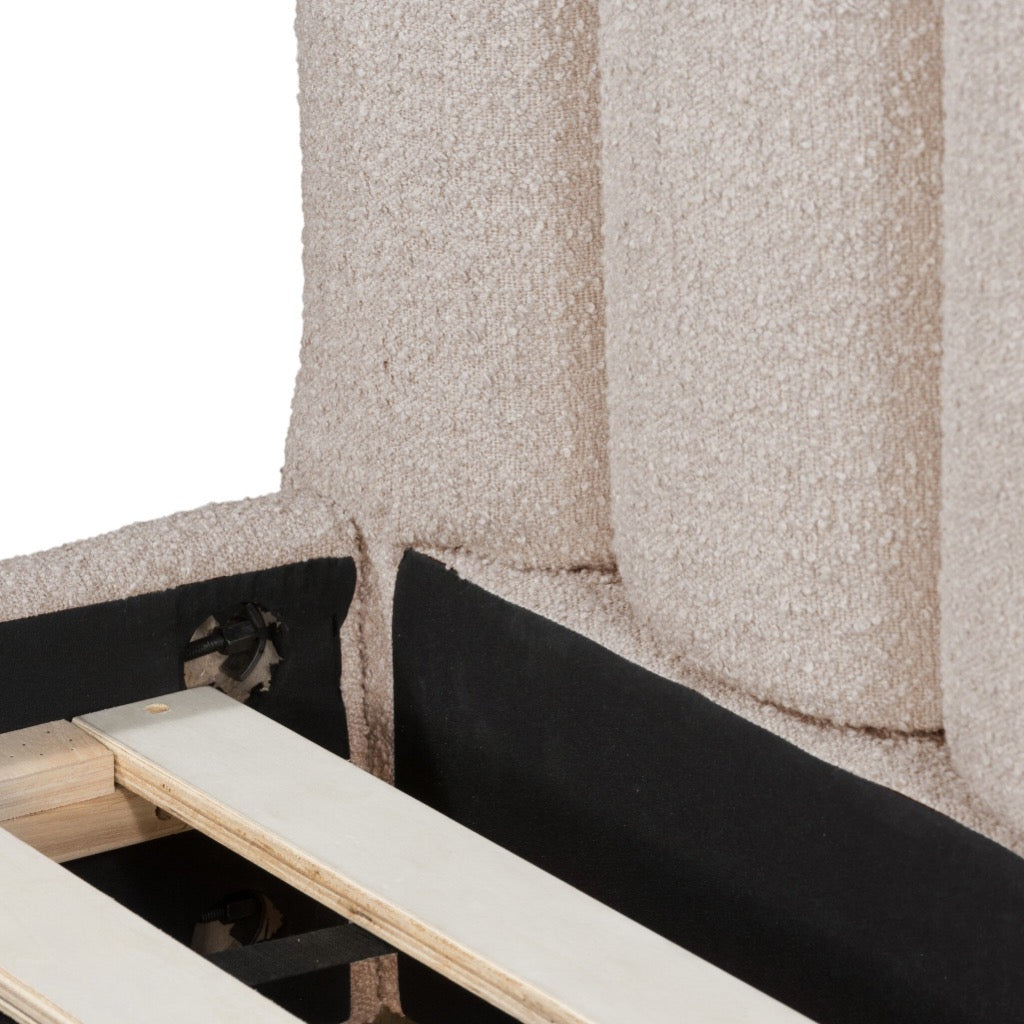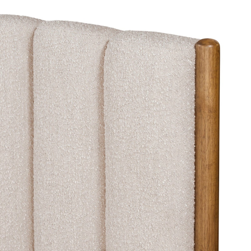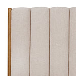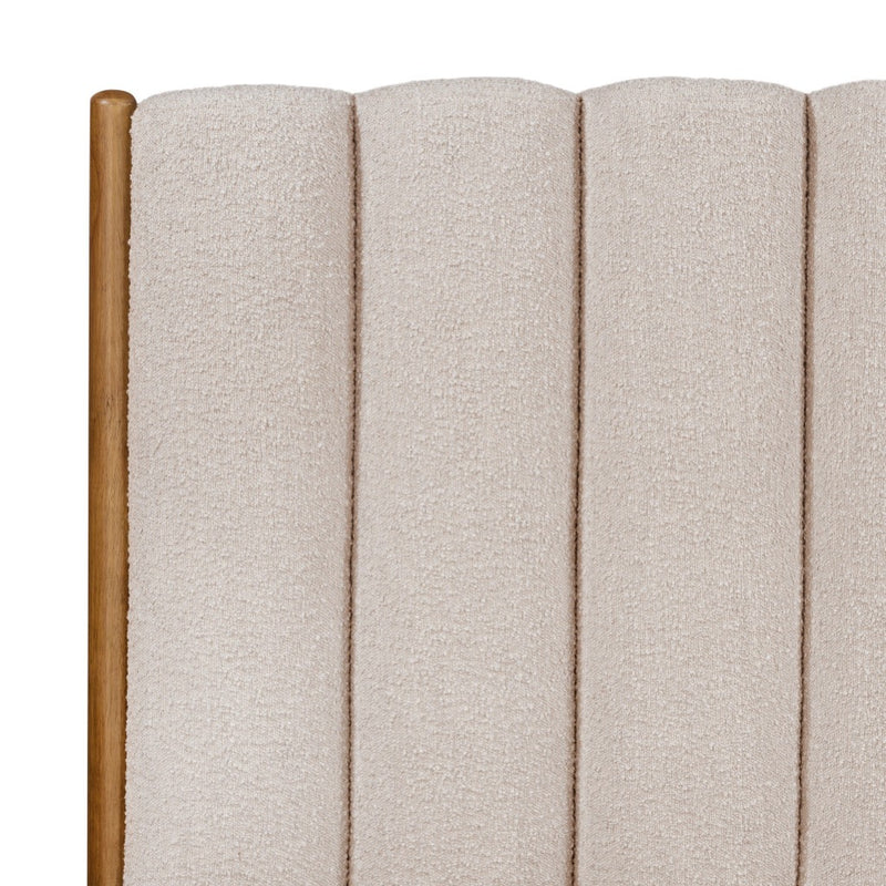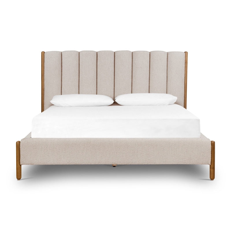 Channel surfing. Upholstered with boucle-like fabric in a neutral sand, parawood legs run the height of a heavily channeled headboard, for a lengthy look with textural depth.