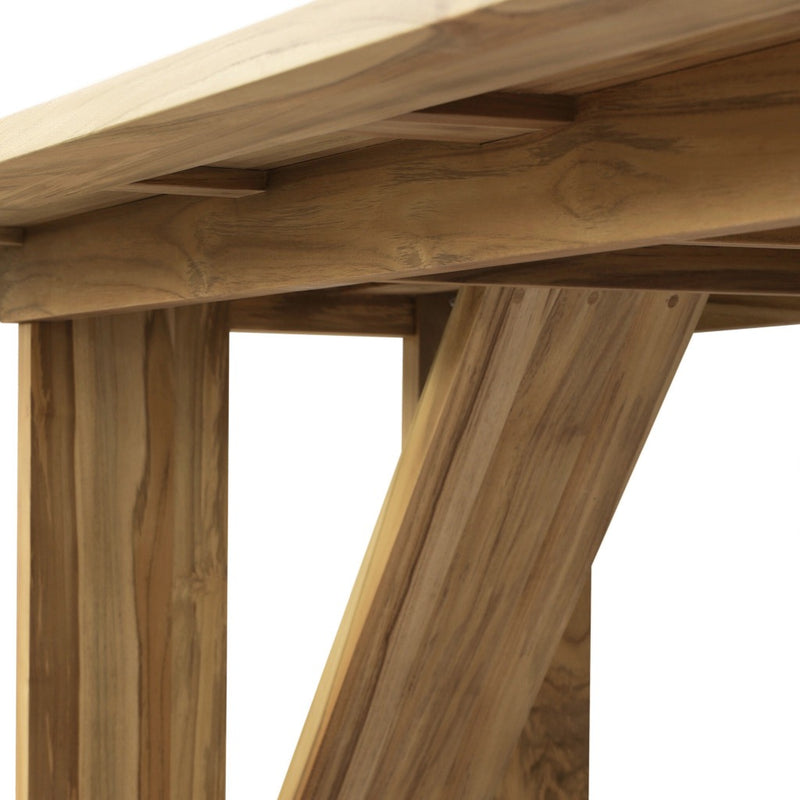 A modern trestle-style outdoor dining table designed with linear detailing. FSC®-certified teak offers a transitional finish that can pair with an array of styles. Cover or store indoors during inclement weather and when not in use.