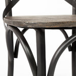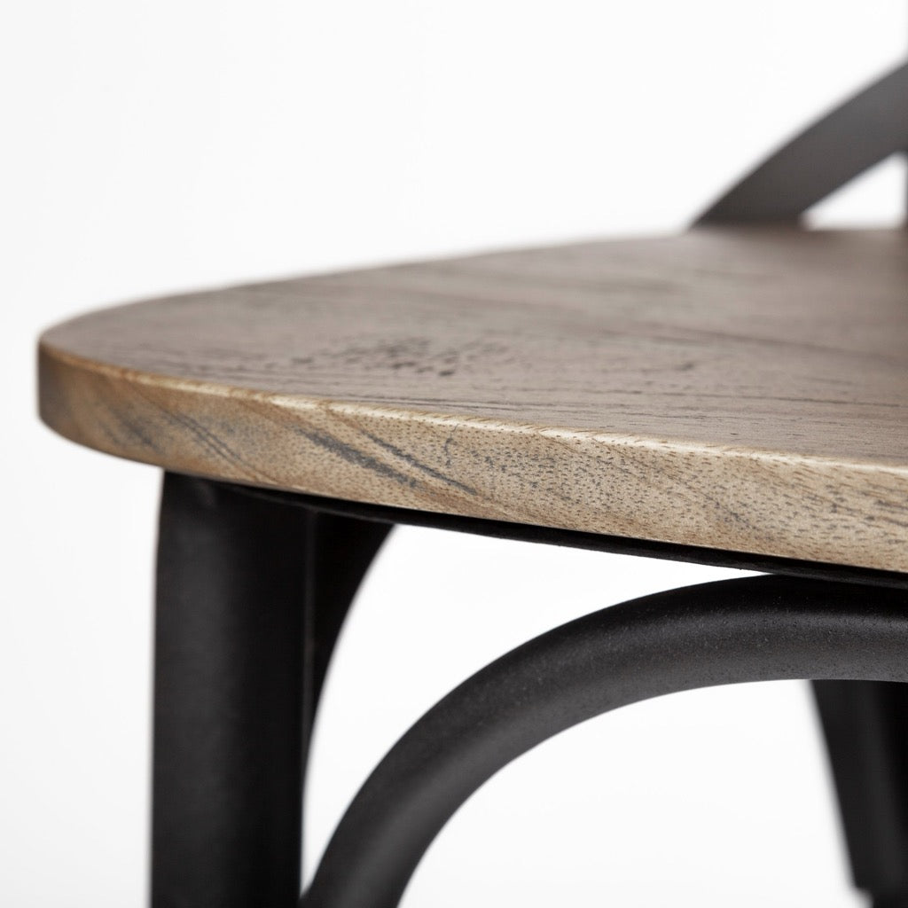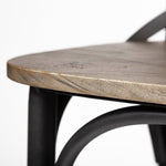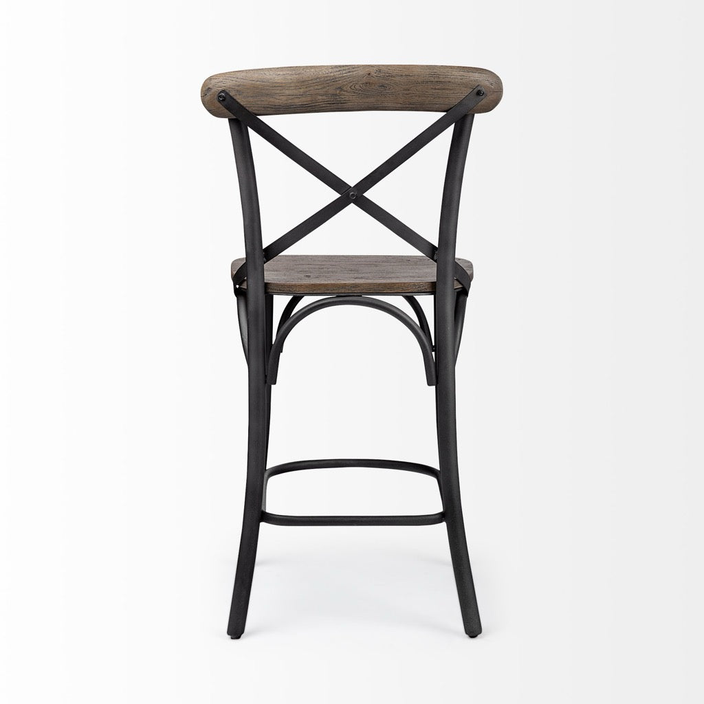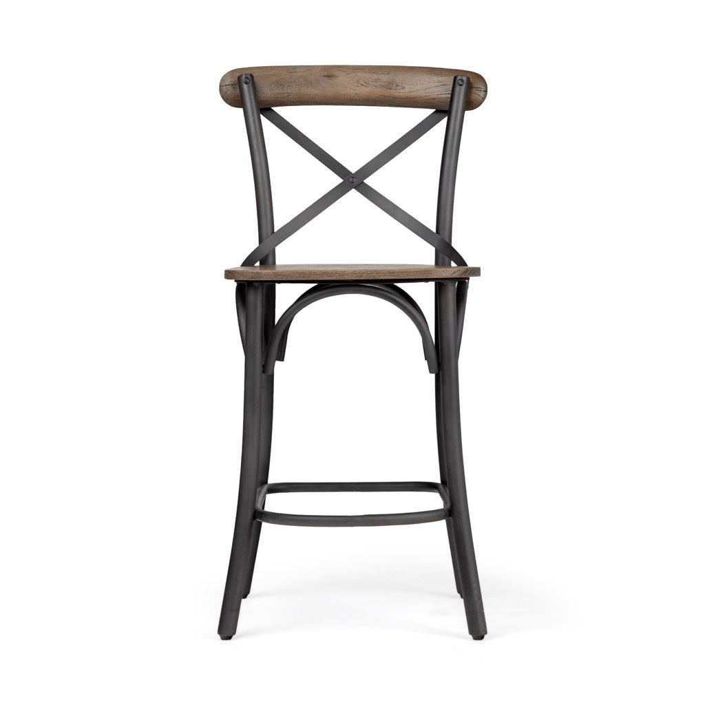 The Etienne is a chair-style, counter height stool with a wooden seat and back supported by a sturdy iron frame.