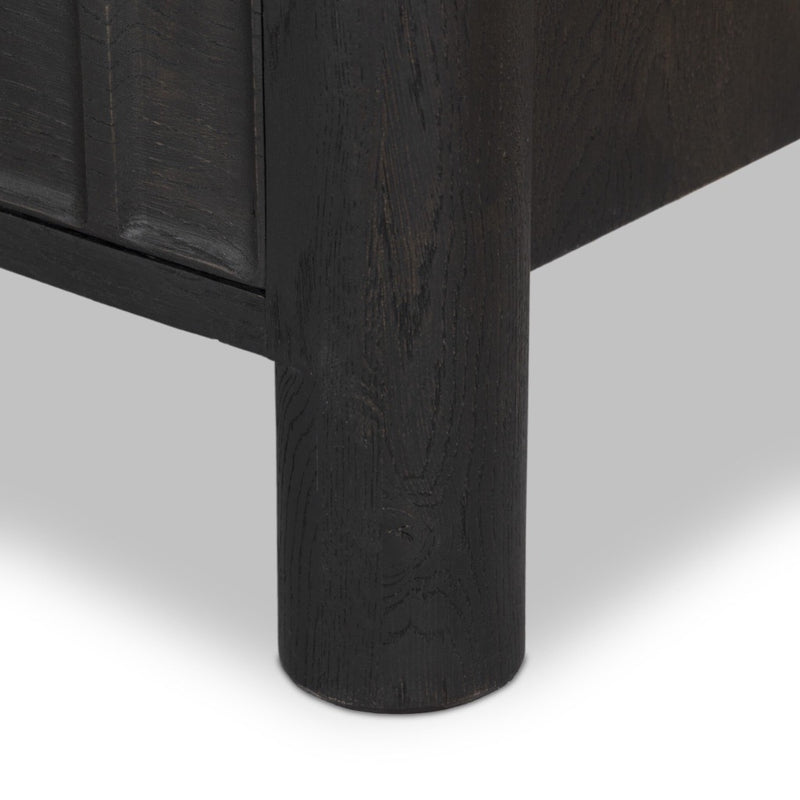 Black oak, organic carving and cylinder legs fuse for a primitive look, while wood's varying grain colors add unique character to each piece.