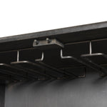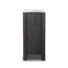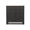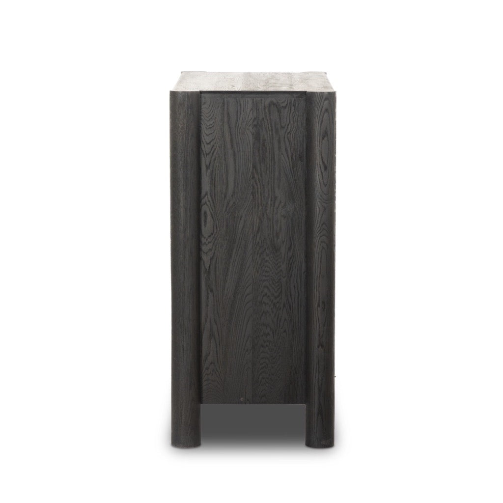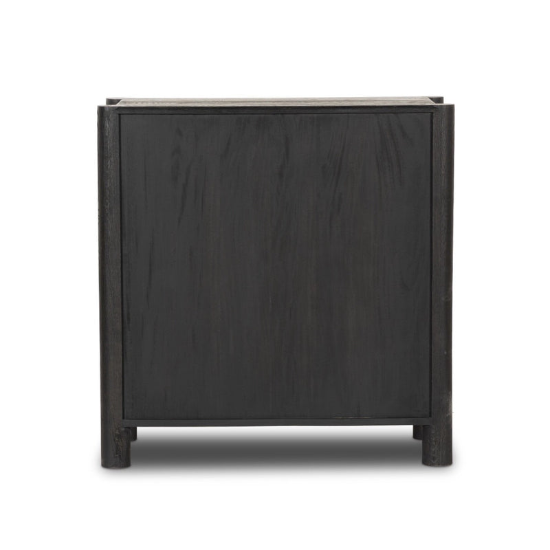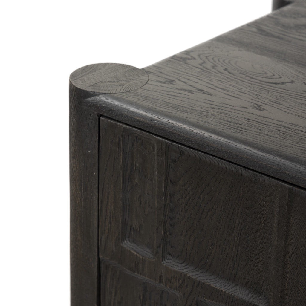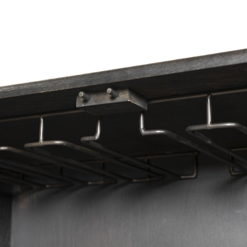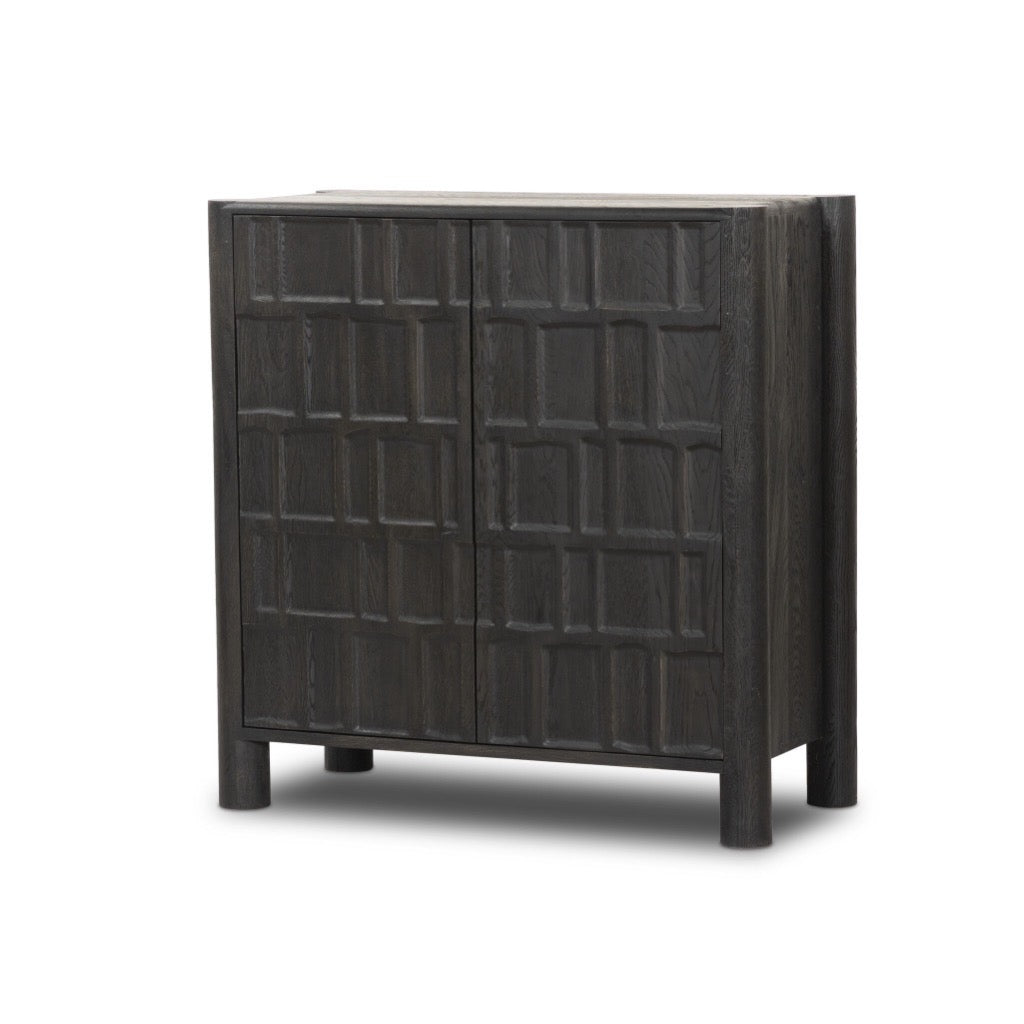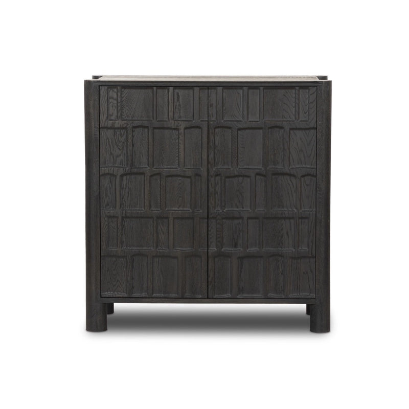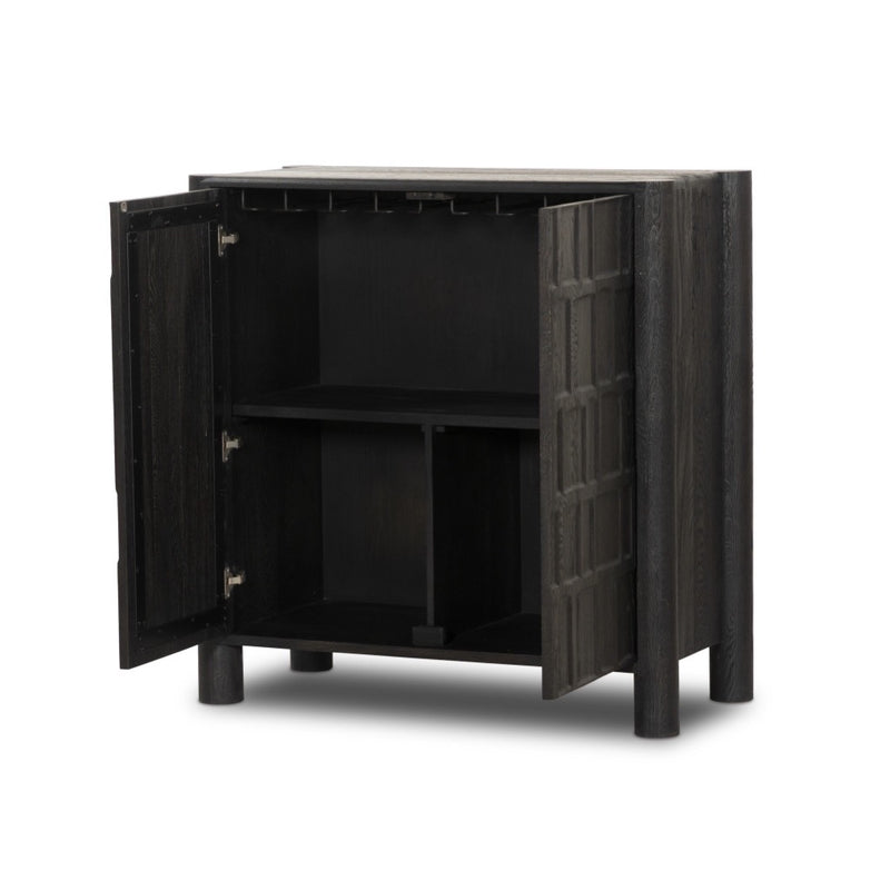 Made from solid oak and mango, unique geometric carving highlights the rich graining on this black-finished bar cabinet. Floor-to-top cylinder legs, plus plenty of interior storage for barware.