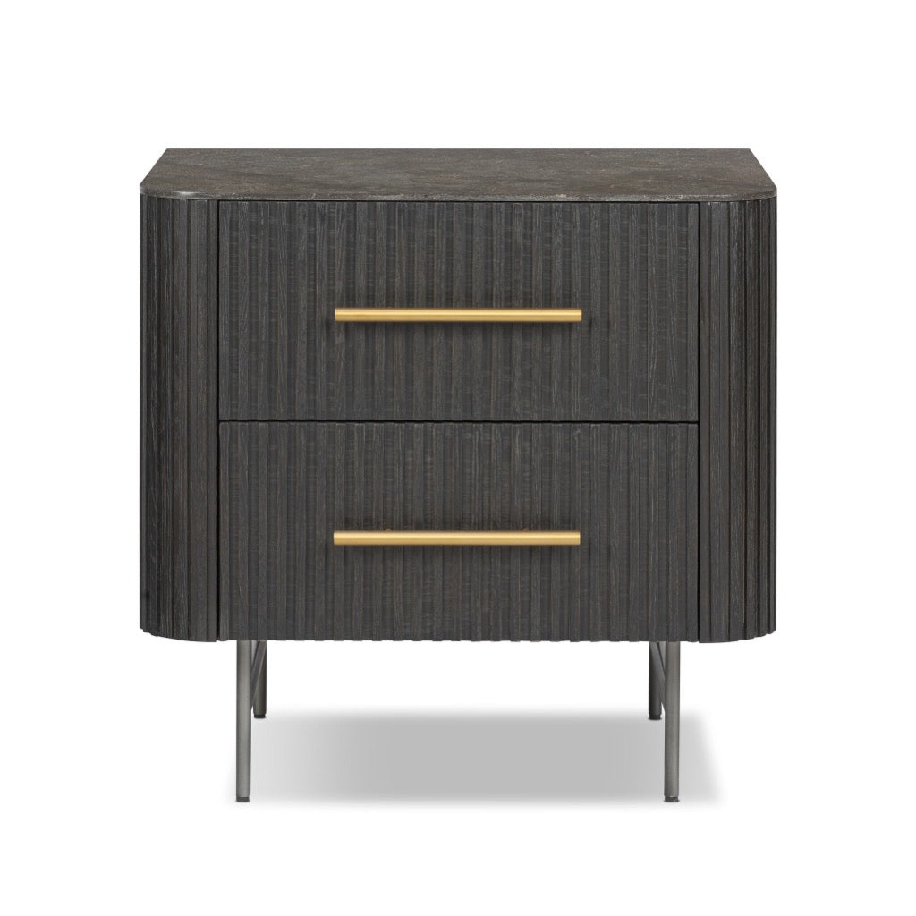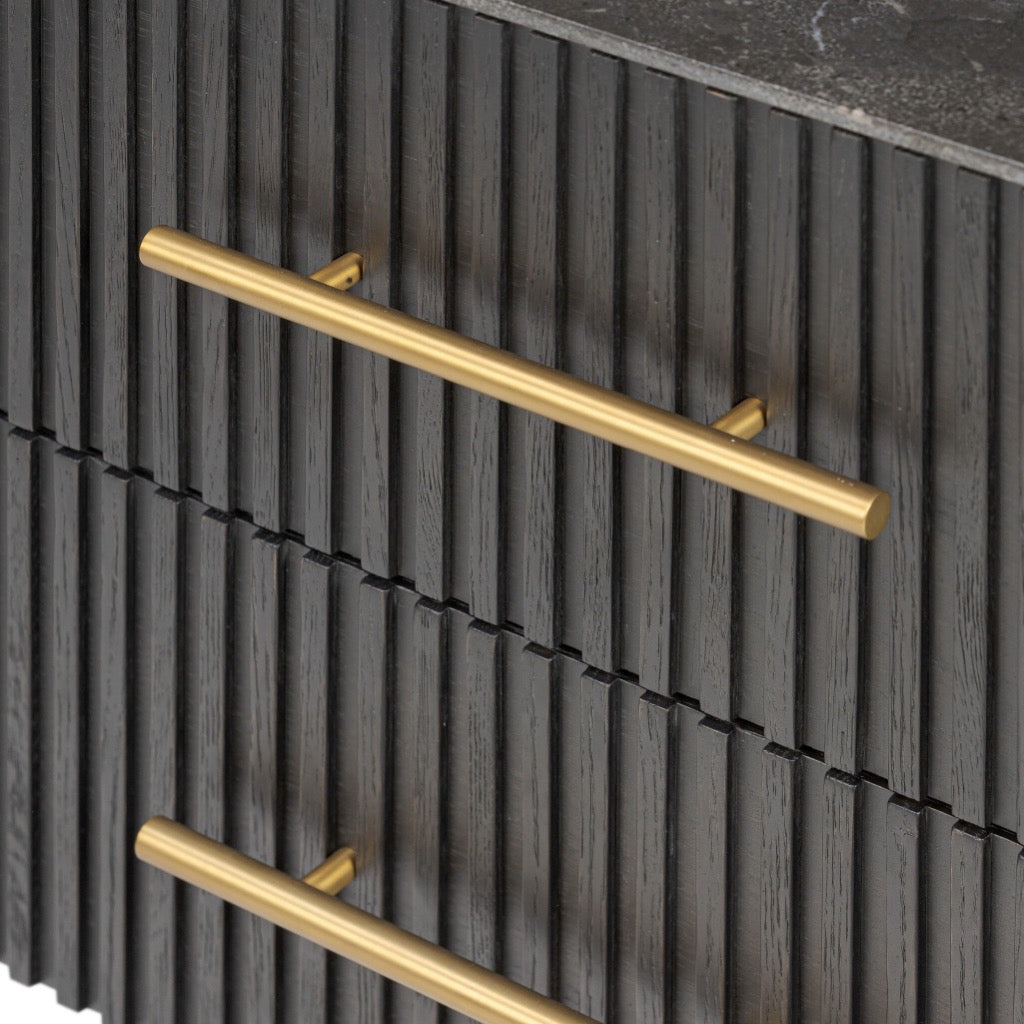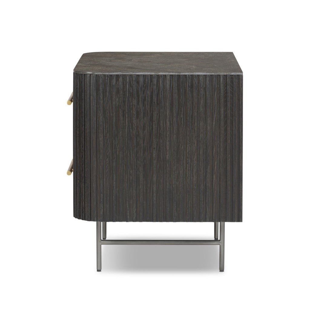 Rich with reeding for great texture and a linear look, brown-finished solid oak frames dual drawers with polished brass hardware and curved corners, while a bluestone top brings a beautifully complementary material mix to bedroom storage. White mineral lines and subtle color, texture and pattern variations are to be expected and speak to each stone's individual nature.