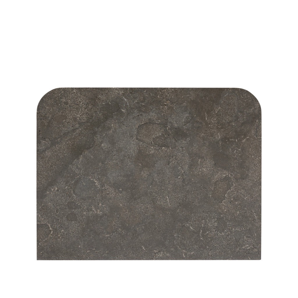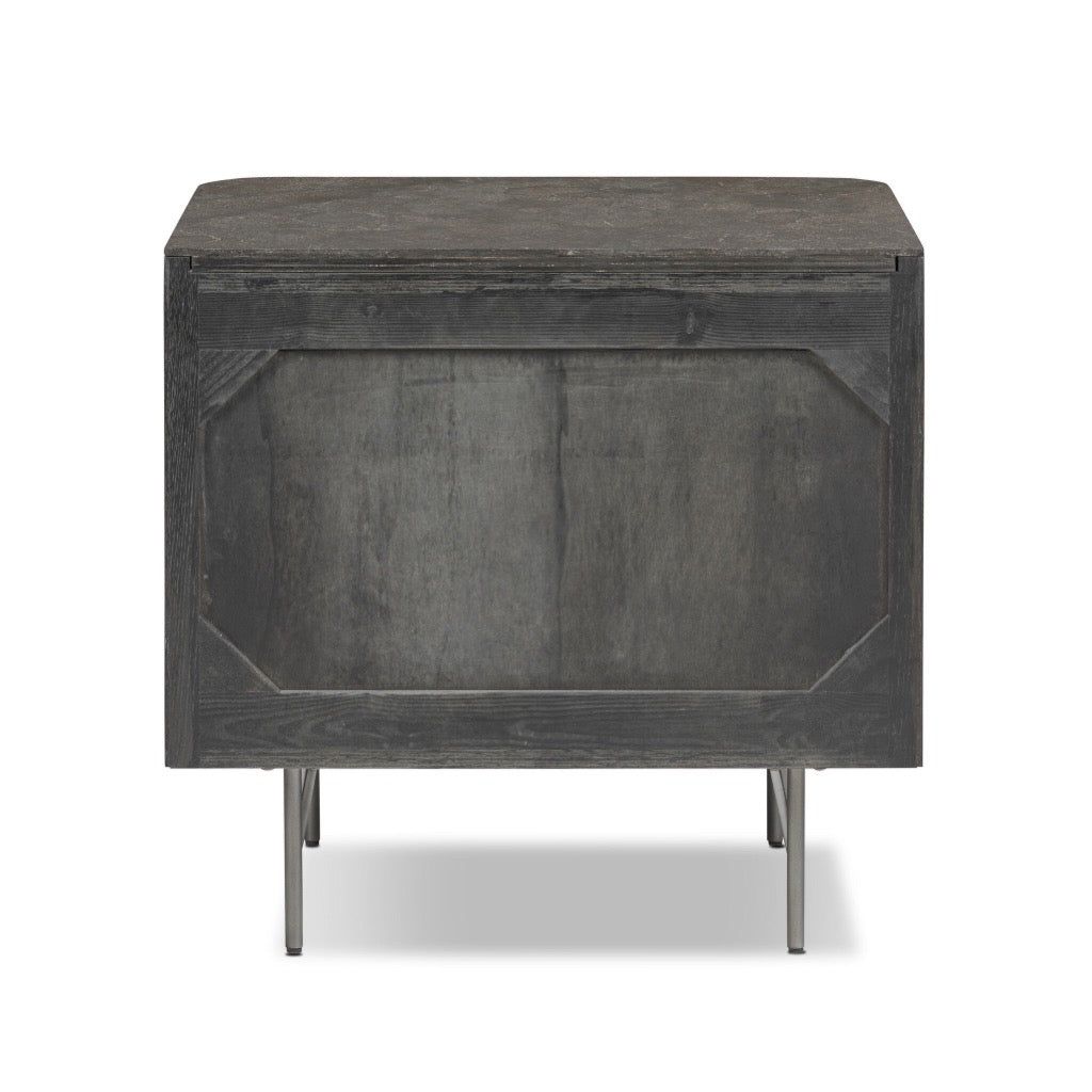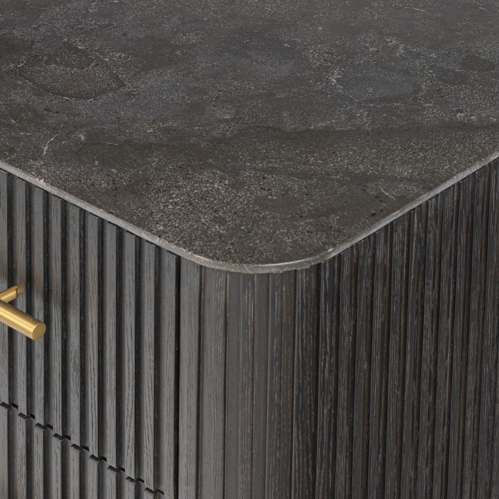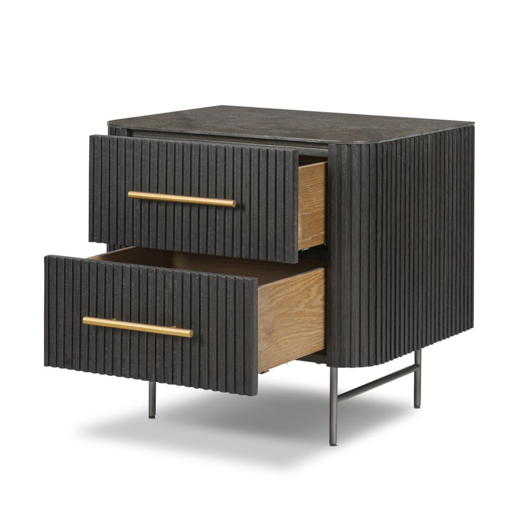 Rich with reeding for great texture and a linear look, brown-finished solid oak frames dual drawers with polished brass hardware and curved corners, while a bluestone top brings a beautifully complementary material mix to bedroom storage. White mineral lines and subtle color, texture and pattern variations are to be expected and speak to each stone's individual nature.