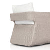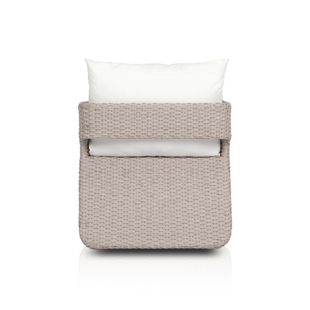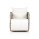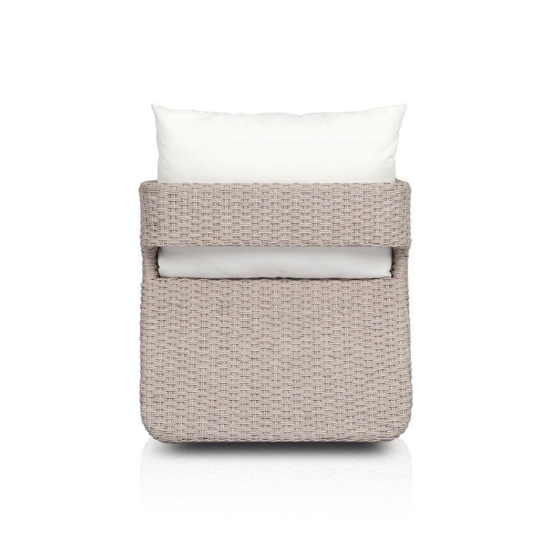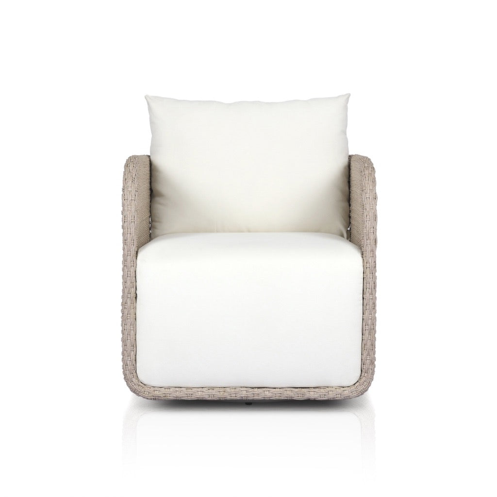 Work some texture into your outdoor styling. Vintage white all-weather wicker shapes a wraparound frame with rear cutout detailing, finished with a 360 swivel. Thick and durable, light grey seating makes this whole outdoor swivel chair modern and monochromatic. Cover or store indoors during inclement weather and when not in use.