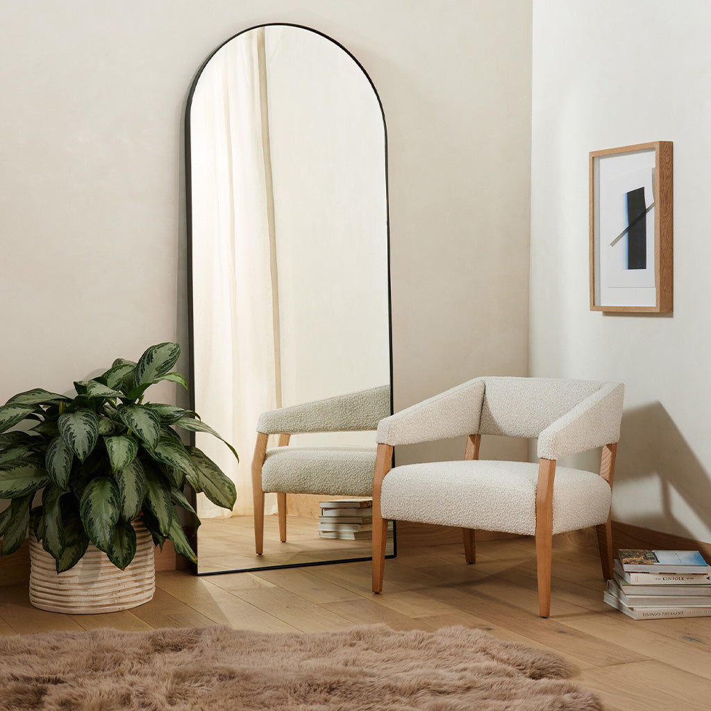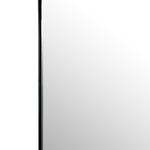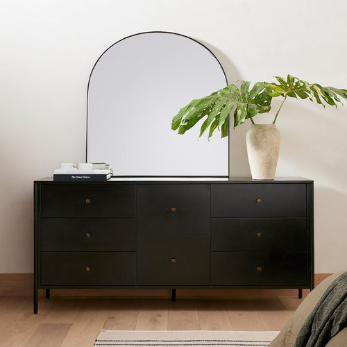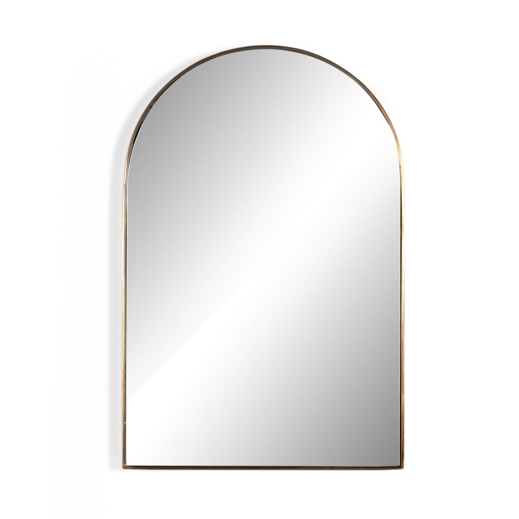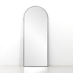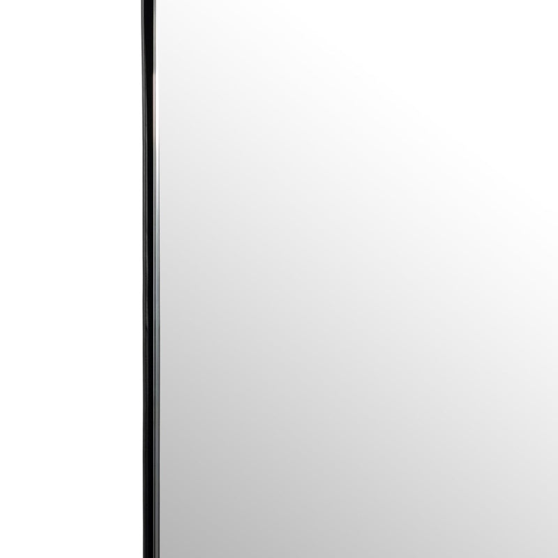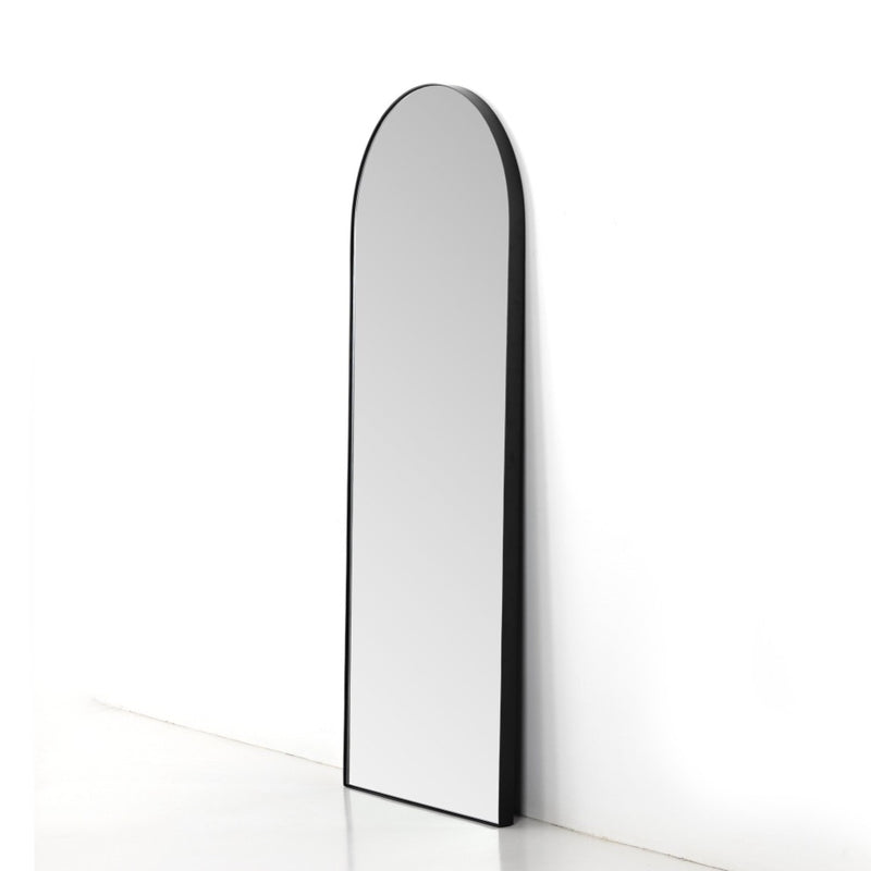 A beautifully arched mirror in an iron frame with a matte black finish.