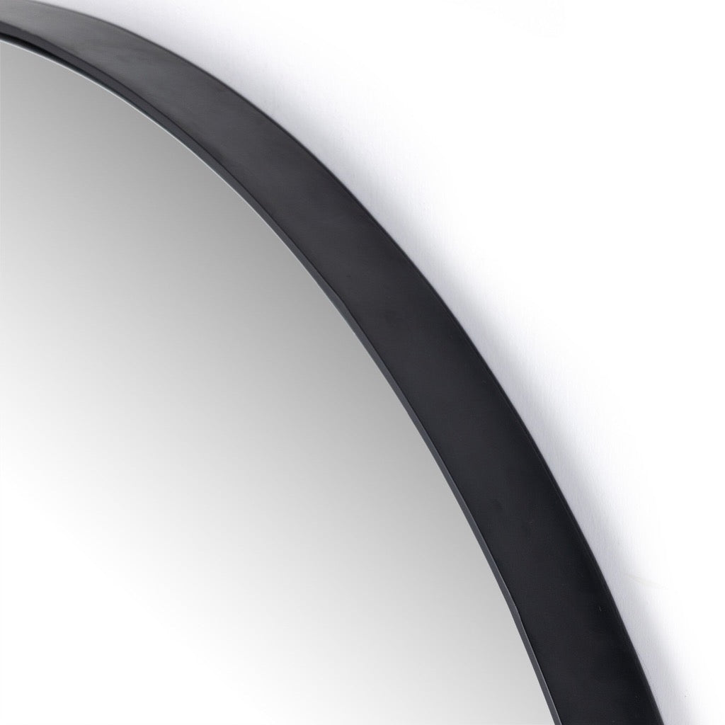 A beautifully rounded mirror in an iron frame with a matte black finish.