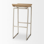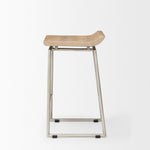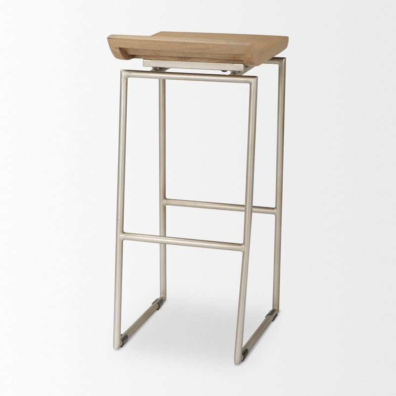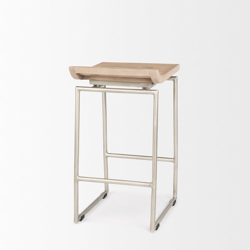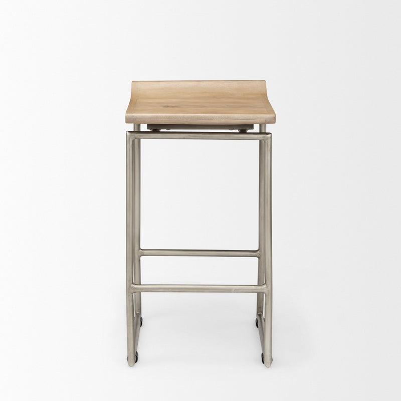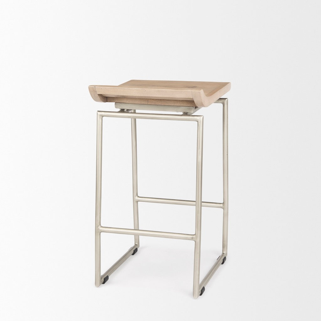 The Givens stool features a contoured seat made from solid wood and is mounted on a sturdy, iron frame. Dual purpose metal bracing also serves as a a comfortable footrest.
