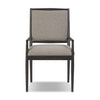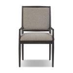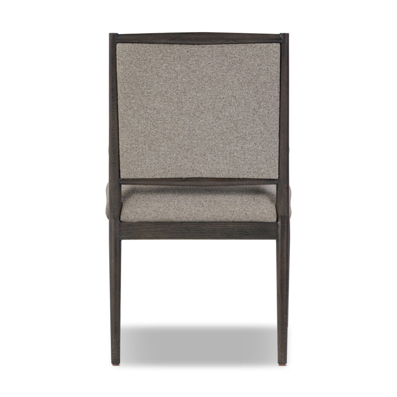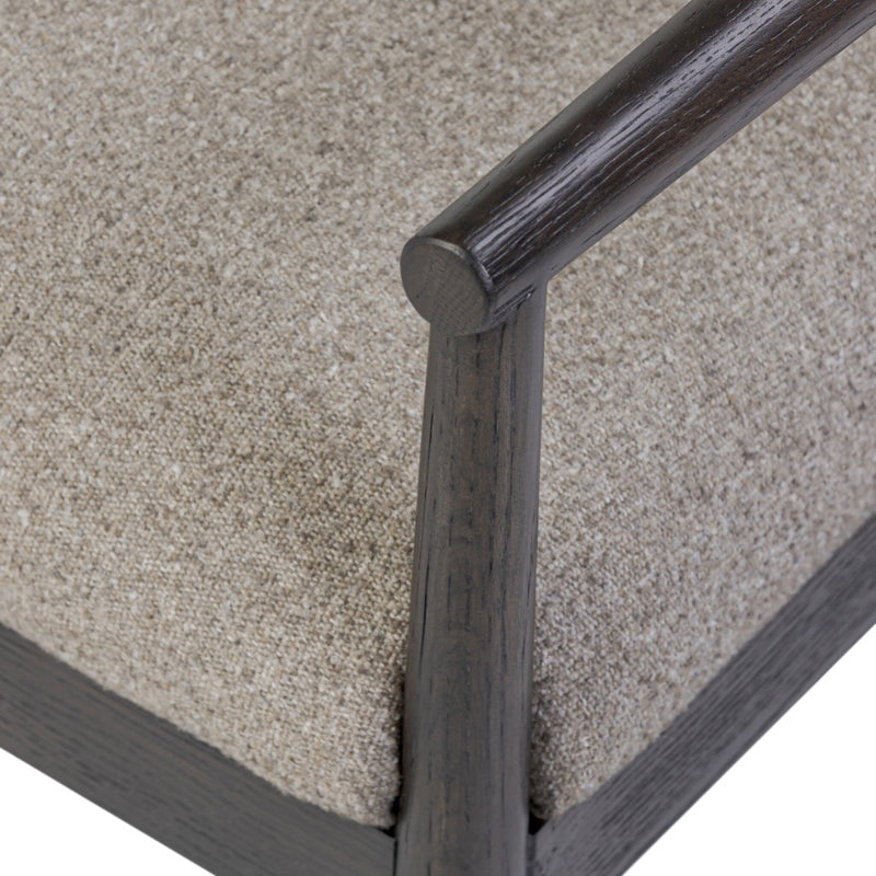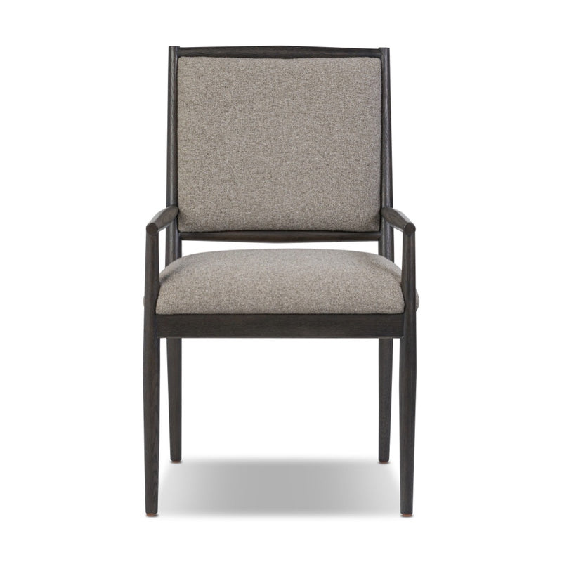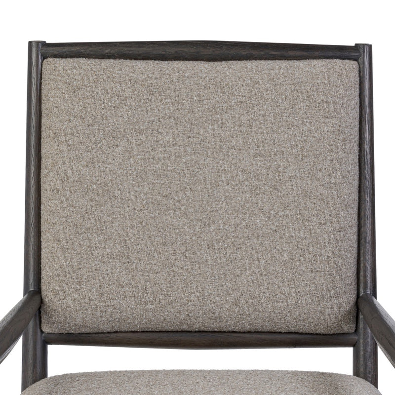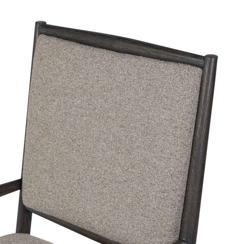 Weathered oak and light, linen-like upholstery fuse for a new take on traditional. Tapered spindle framework complements the clean lines of this dining armchair.