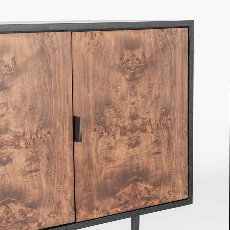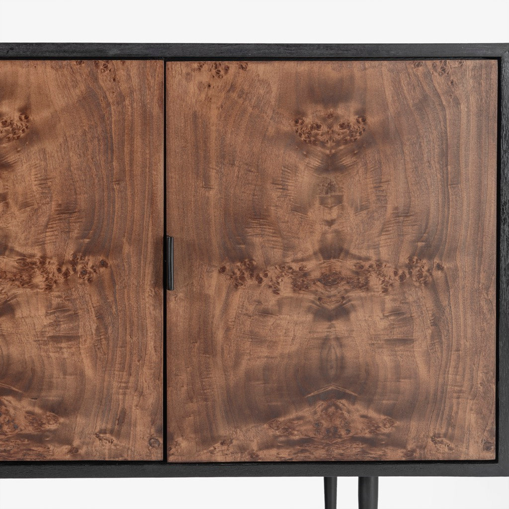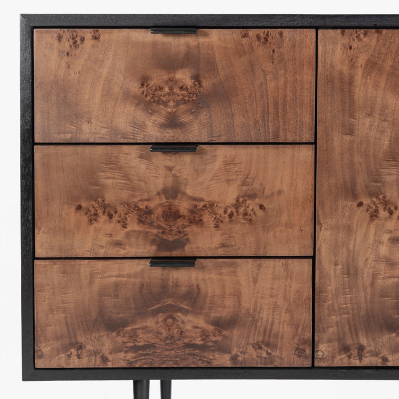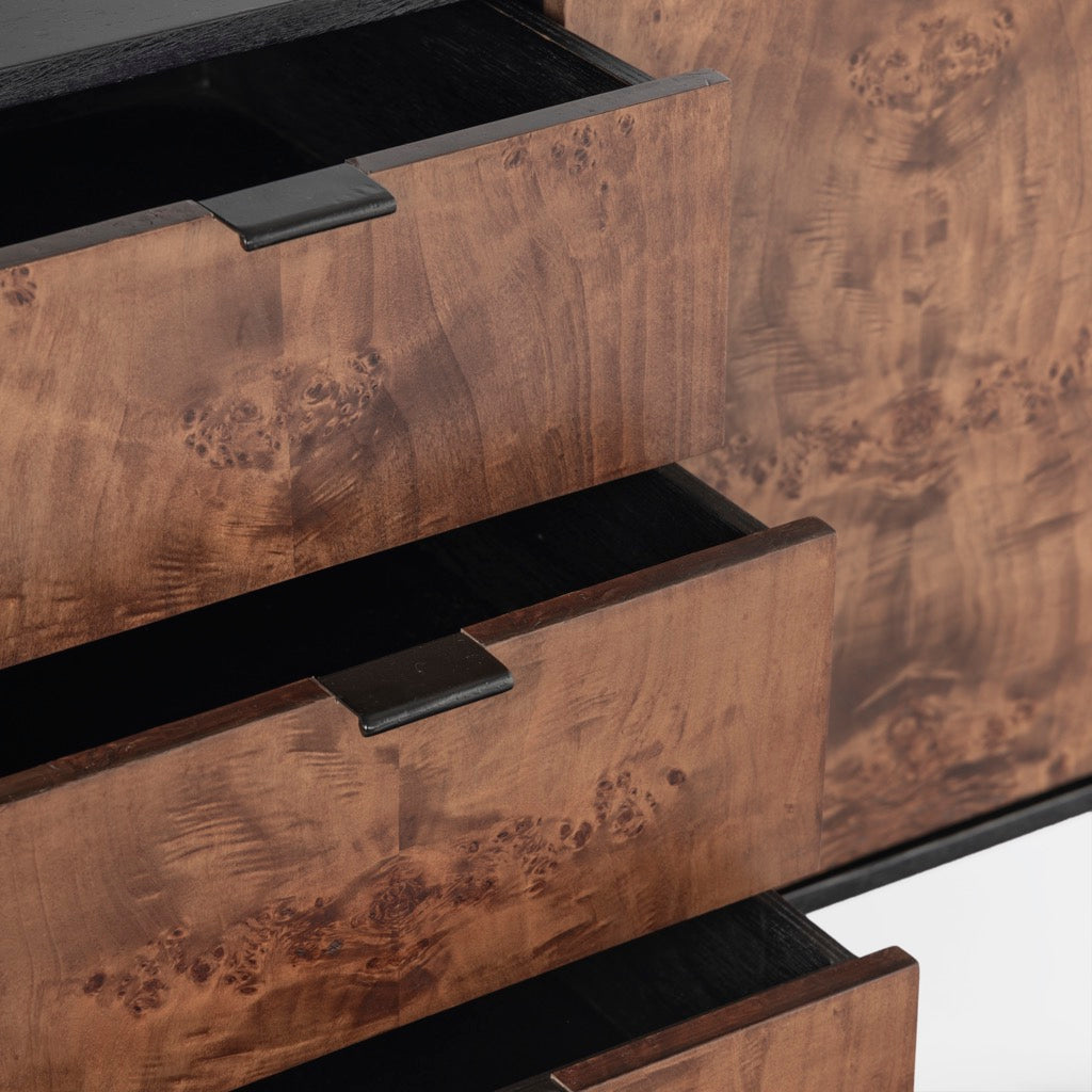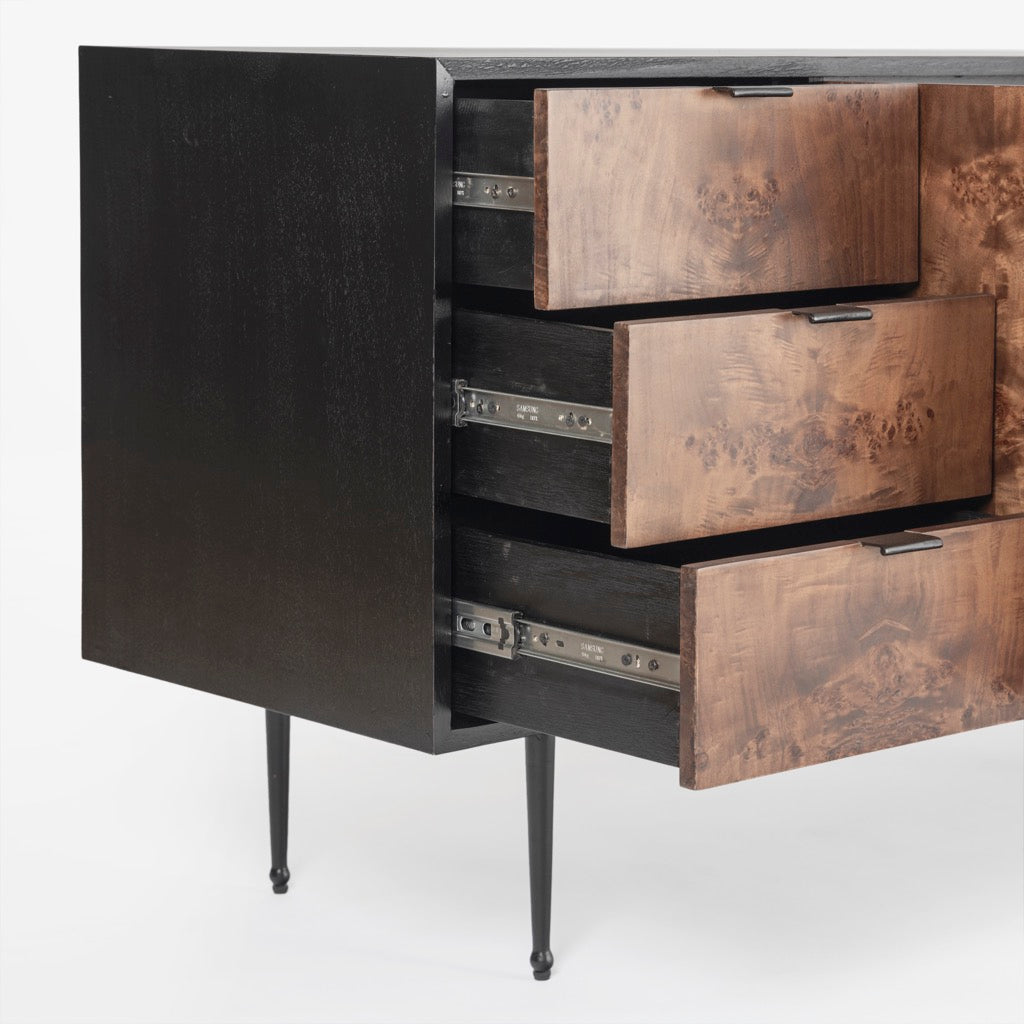 Discover the timeless charm of the Gregory Buffet. This modern masterpiece features a Burl veneer cabinet with the option of a light or dark burl, artfully paired with a solid wood black outer case. The inclusion of cast iron legs and drawer pulls adds an industrial touch, creating a statement piece that seamlessly blends sophistication with functionality.