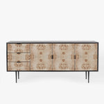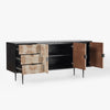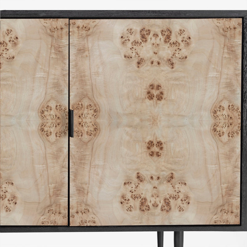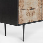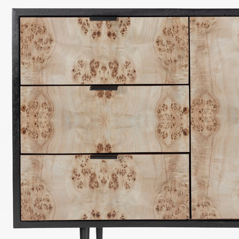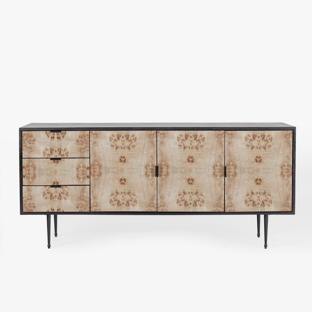 Discover the timeless charm of the Gregory Buffet. This modern masterpiece features a Burl veneer cabinet with the option of a light or dark burl, artfully paired with a solid wood black outer case. The inclusion of cast iron legs and drawer pulls adds an industrial touch, creating a statement piece that seamlessly blends sophistication with functionality.