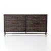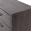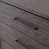 A floating iron base lightens the natural depth of grey-finished oak, as clean lines lend a tailored look to warm rustic tones. Six spacious drawers bring plenty of storage options to the modernized bedroom.