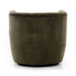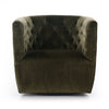 A perfectly curved statement on a 360 swivel. Velvety olive upholstery is pristinely tailored, with dramatic blind tufting and high, shapely arms. Fabric features subtle highs and lows that change in appearance depending on the direction of the fabric's nap.
