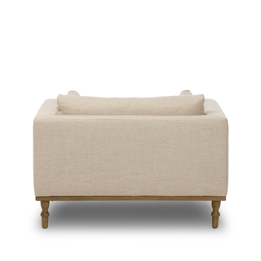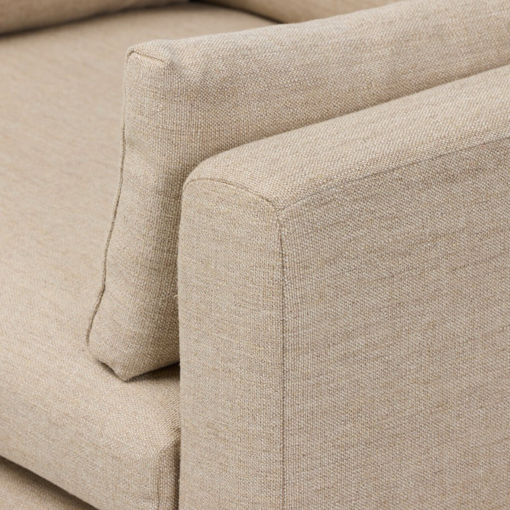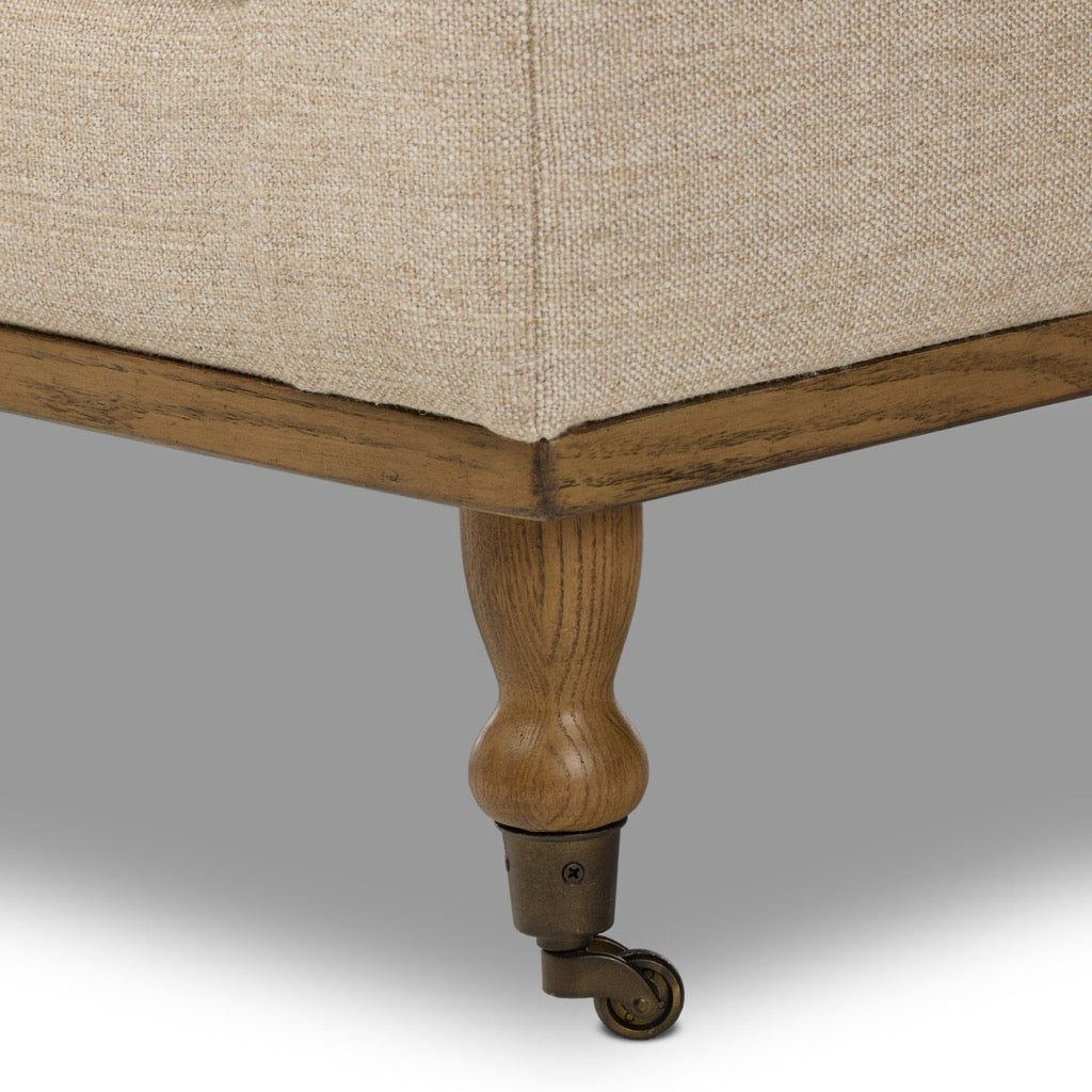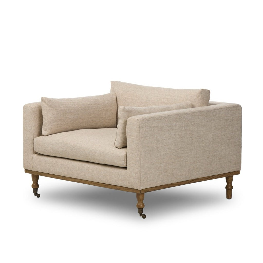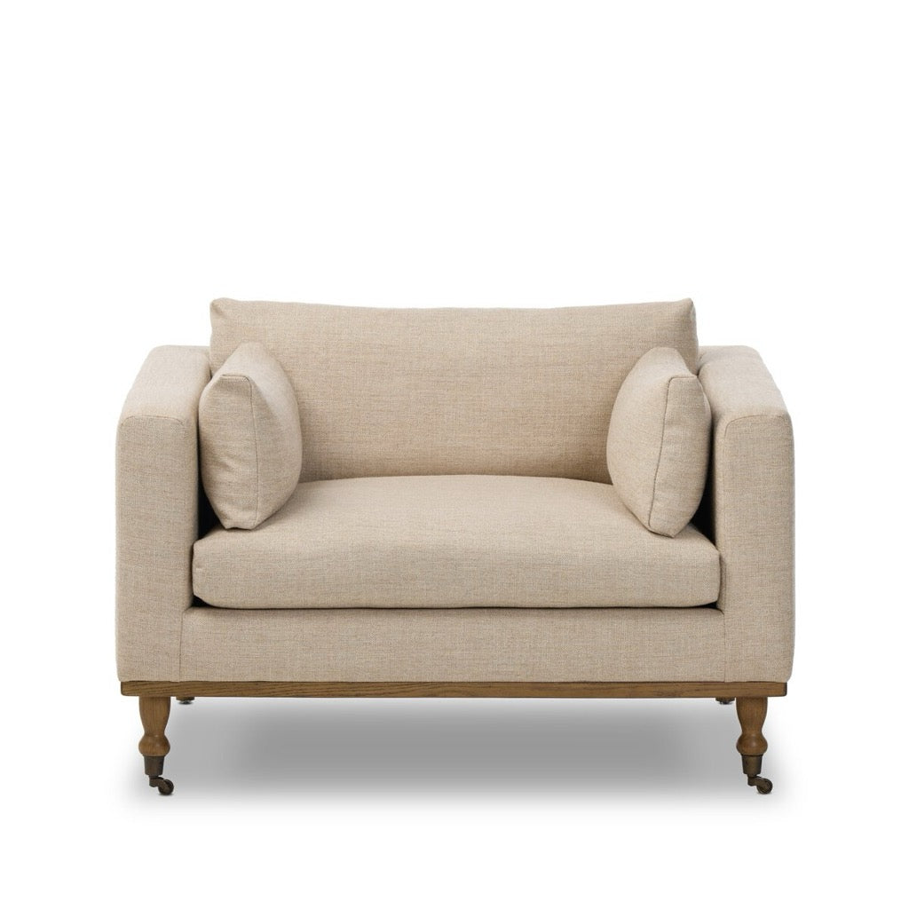 With traditional details like turned oak legs and brass casters, this low-profile accent chair features an elongated bench seat for an inviting sit. Performance fabric in neutral wheat finishes a knife-edge back and boxed arm cushions.