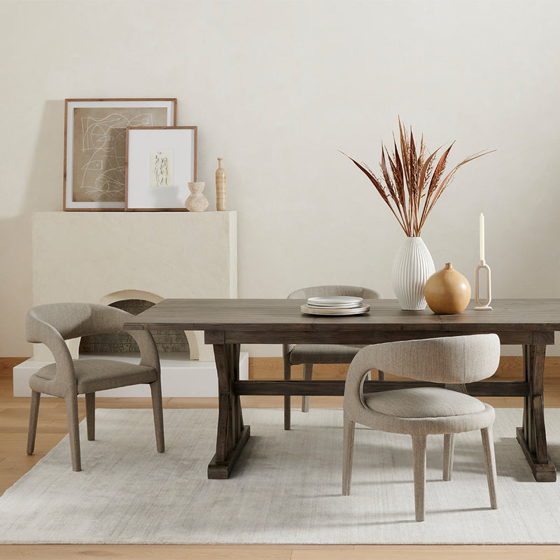 Strike a pose. Well curved and finely sculpted, high-performance linen-blend upholstery makes for a shapely, sensible addition to the modern dining room.