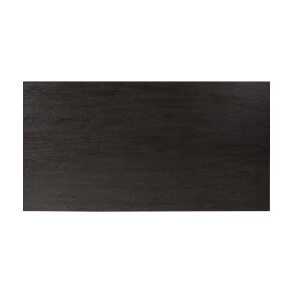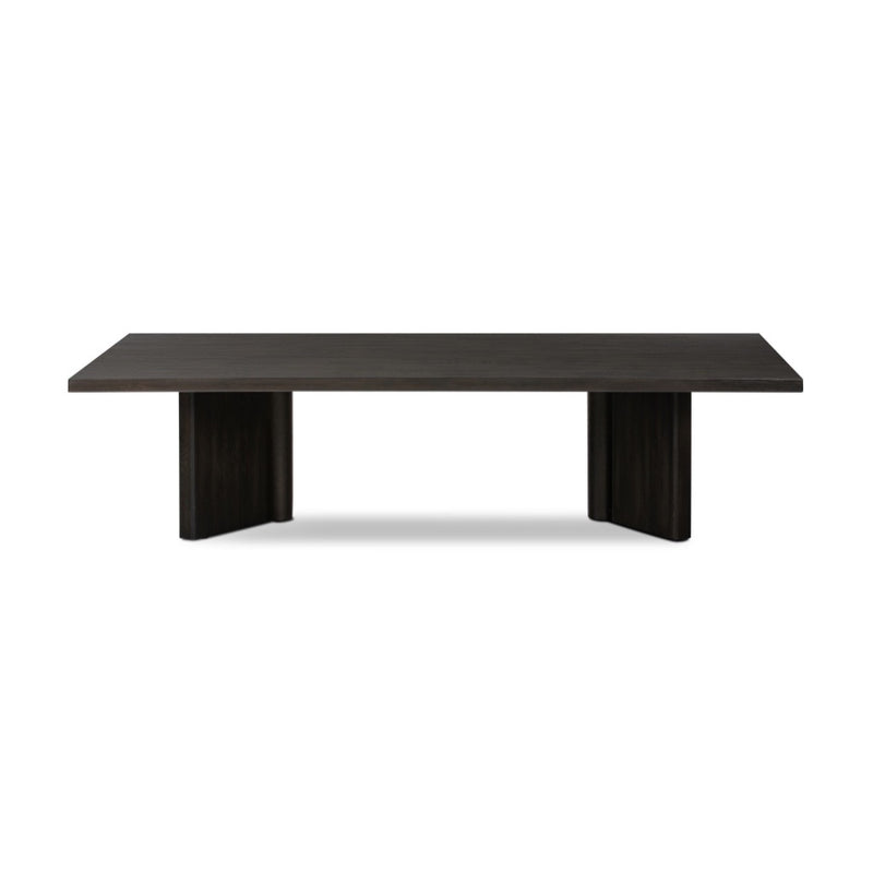 A smoked black finish delivers a character-rich look to a rectangular coffee table. Angled panel legs up the intrigue factor.