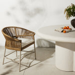 A beautiful rope-based design in caramel tones is woven across a durable aluminum frame. Features a comfortable barrel shape with angled detailing all around. Topped with a removable cushion upholstered in 100% Olefin, known for its UV-resistant, water-repellent and quick-drying abilities. Cover or store inside during inclement weather and when not in use.