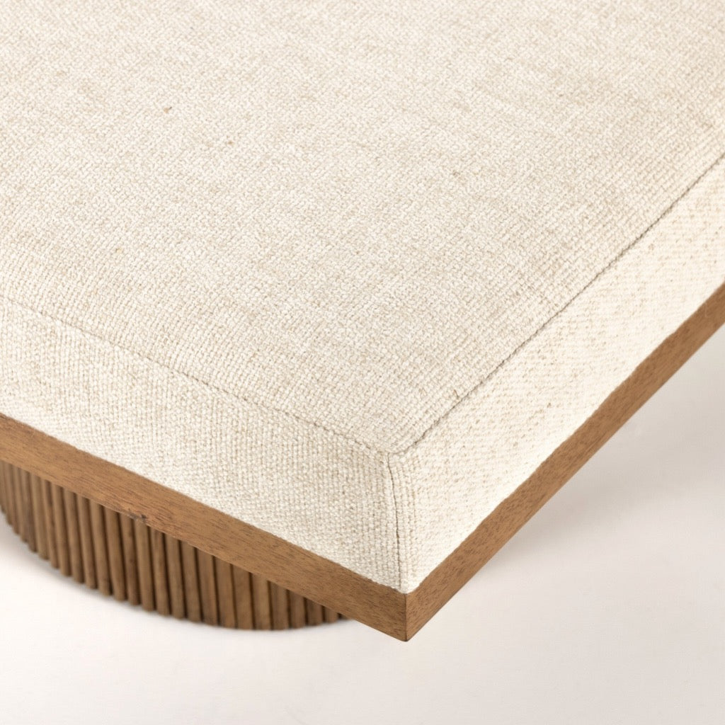 Finished in a warm honey, column-style legs of rubberwood veneer feature bullnose reeding for a midcentury-inspired touch. Upholstered with cream-colored high-performance fabric exclusive to Four Hands, fixed cushioning and a loose headrest invite you to settle in.