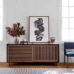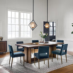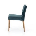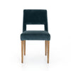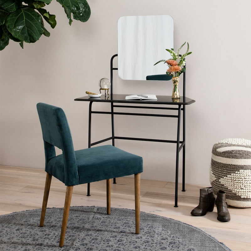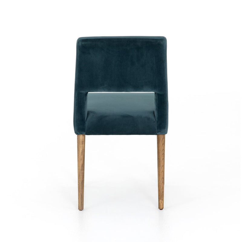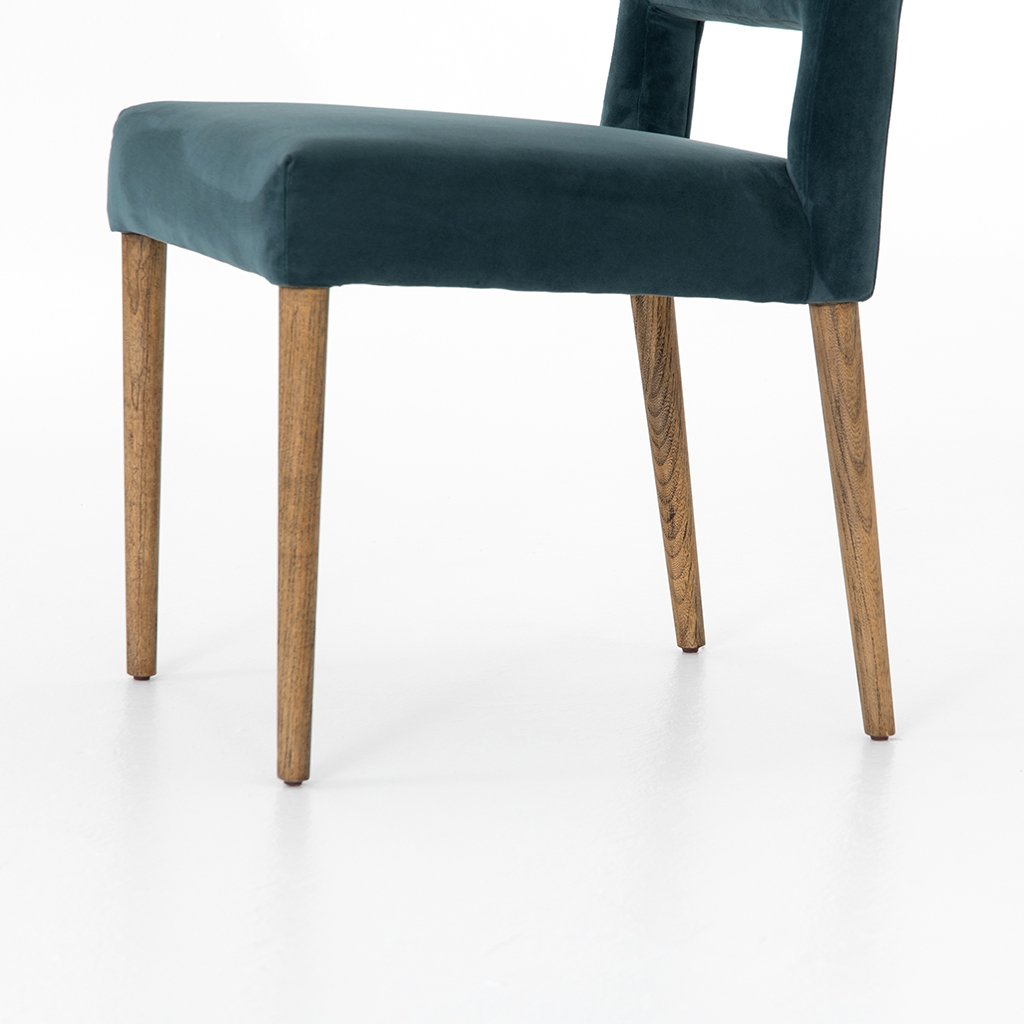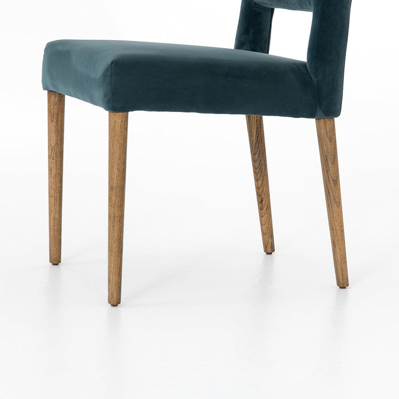 Slimly styled and mid-century minded, velvety teal upholstery features a posterior cutout for added flair. Toasted nettlewood legs offer natural contrast.