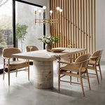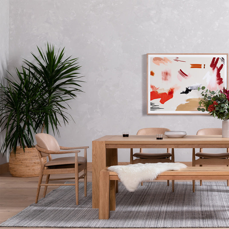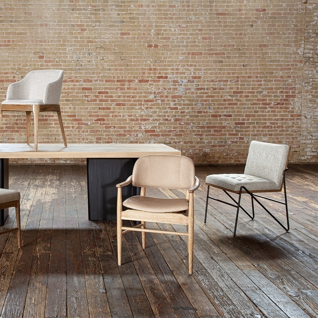 Mid-century vibes meet modern materials. Whitewashed oak frames float-like seating of top-grain leather in a versatile light tan, with sloped arms and cone-tapered legs adding to a beautifully sculpted silhouette.