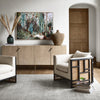 Textural and curve driven. Inspired by Japanese Tatamis, a cleverly constructed outer frame consists of natural cane and black parawood paneling. Adding to that clean color contrast sits cream linen-blend performance seating exclusive to Four Hands, with one knife-edge pillow for added comfort.