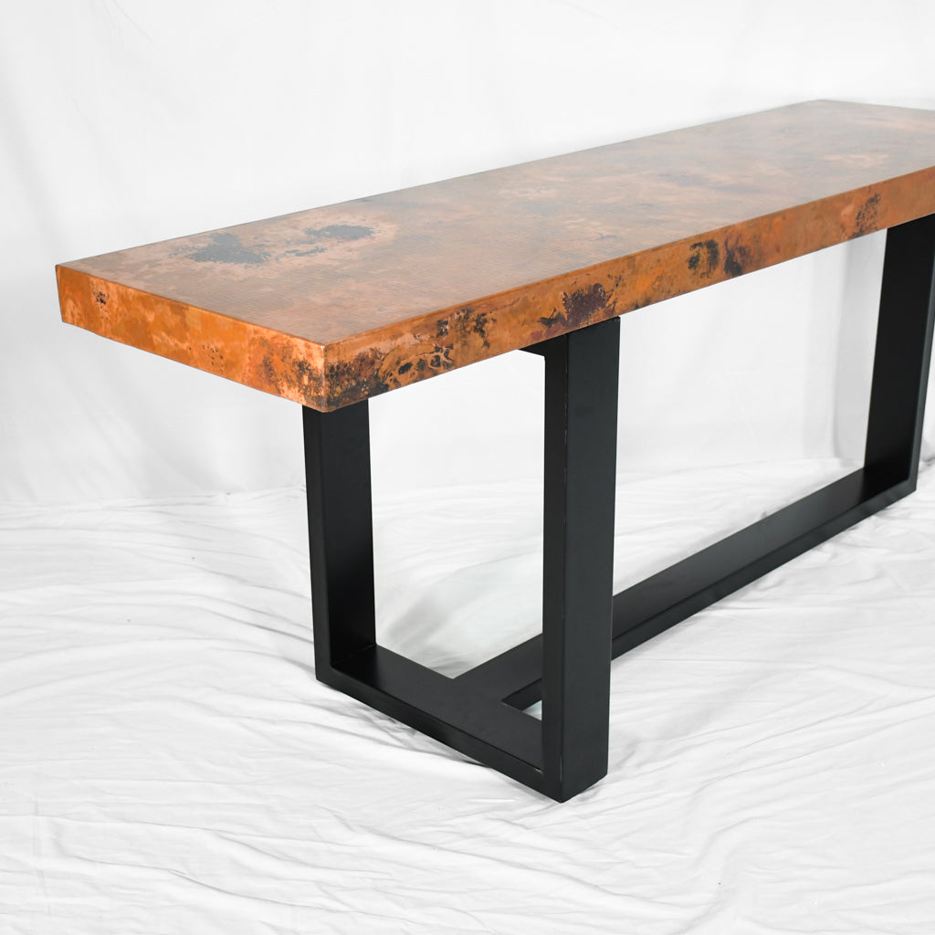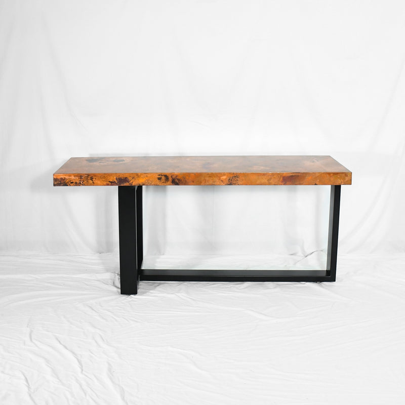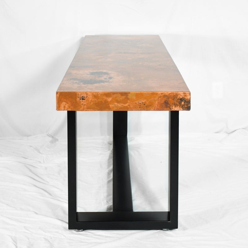 Copper Tabletop: The "Natural w/ Spots" patina shown here is created using a mixture of minerals and open wood-bark fire. It is this mixture of minerals, flame, heat, smoke and ash that create the unique variations in color that you see. The colors are consistent, however the patterns and variances in light and dark will be unique.