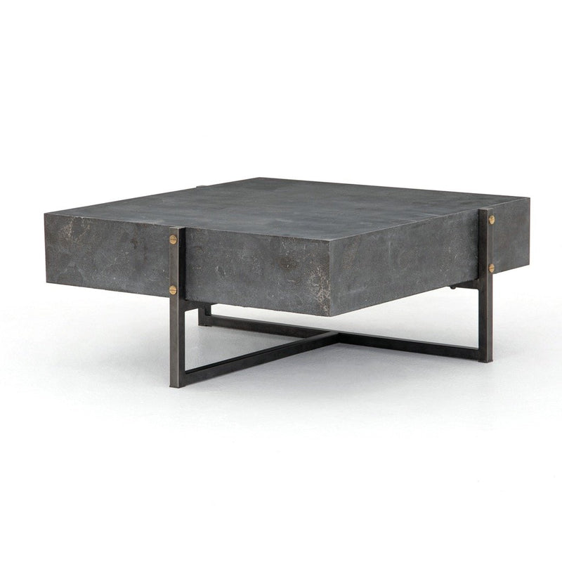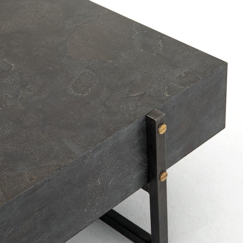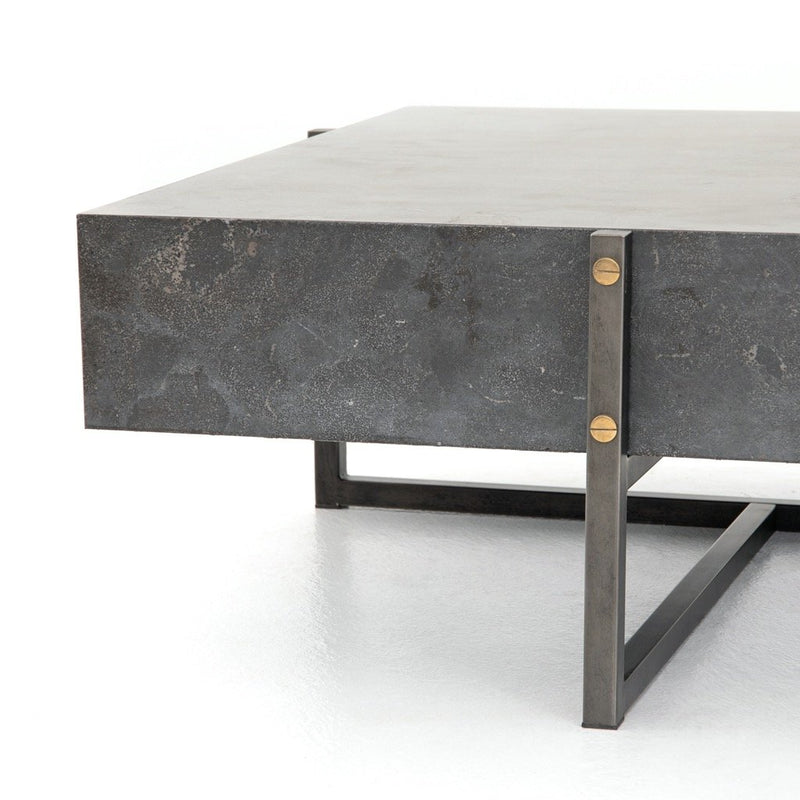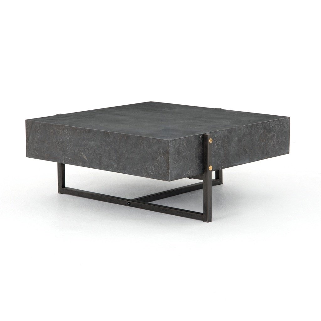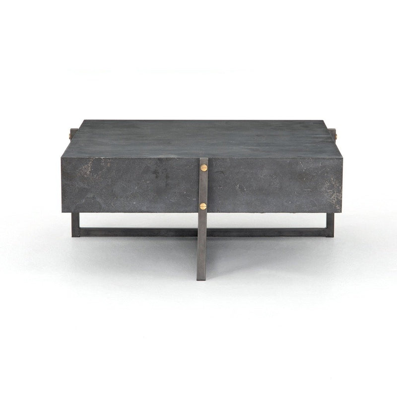 Style, squared. A low, modern-minded coffee table of bluestone veneer sits within rustic black iron framing, for a light look with substantial feel, and a side of industrial edge.