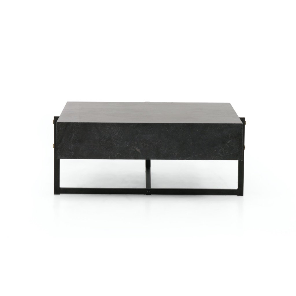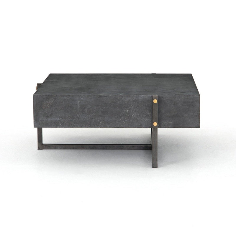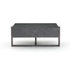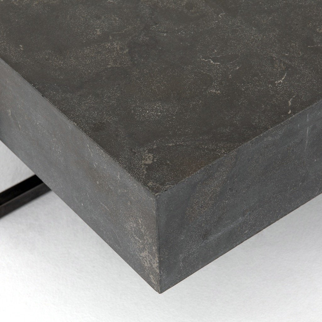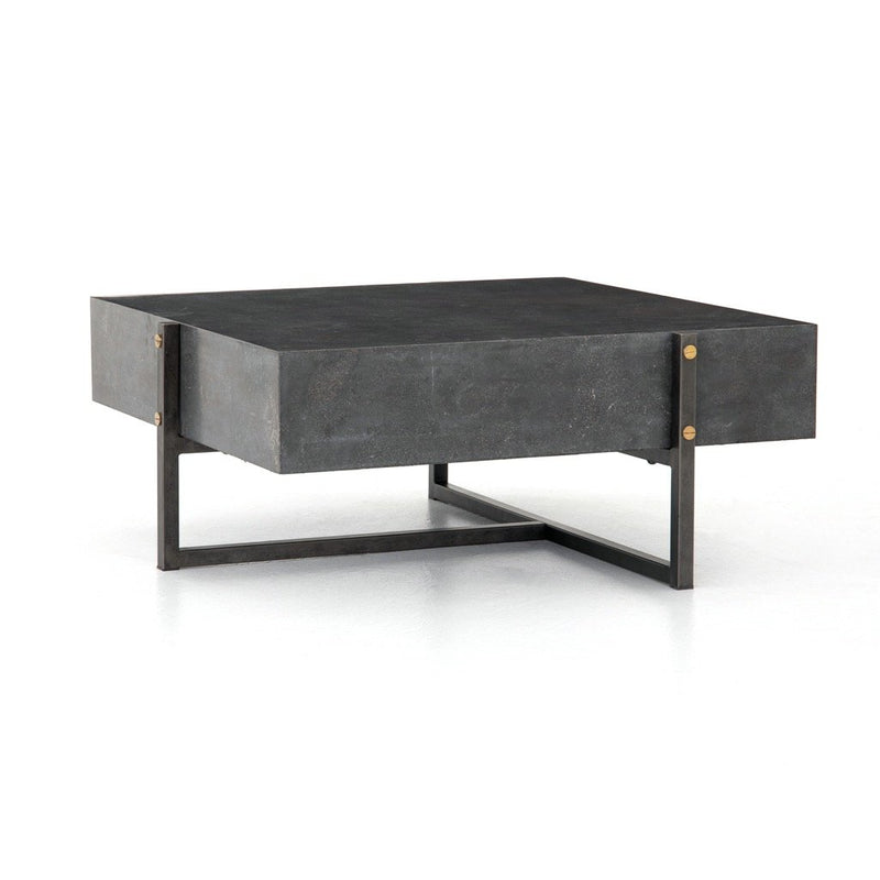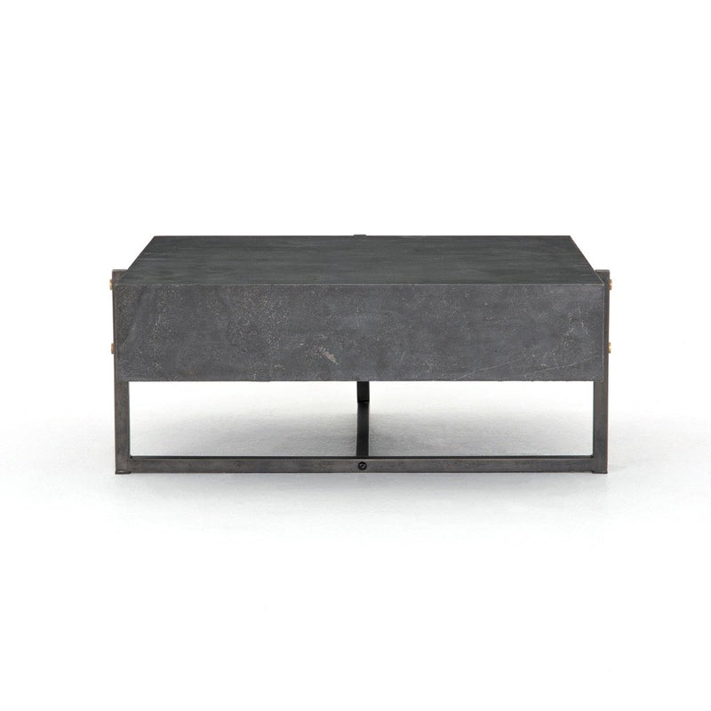 Style, squared. A low, modern-minded coffee table of bluestone veneer sits within rustic black iron framing, for a light look with substantial feel, and a side of industrial edge.