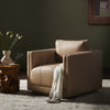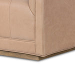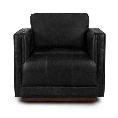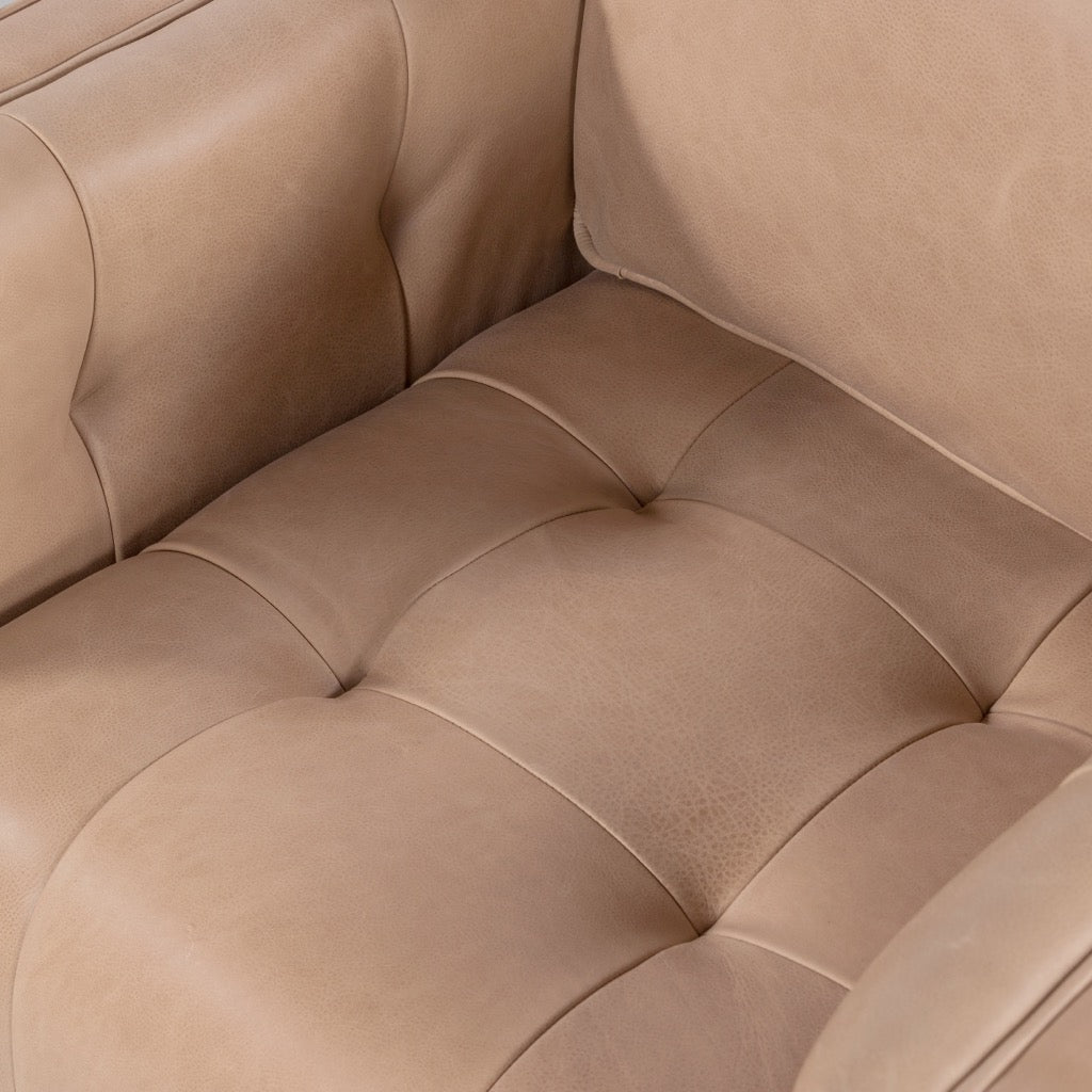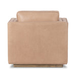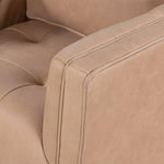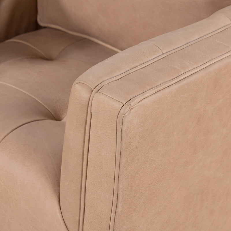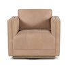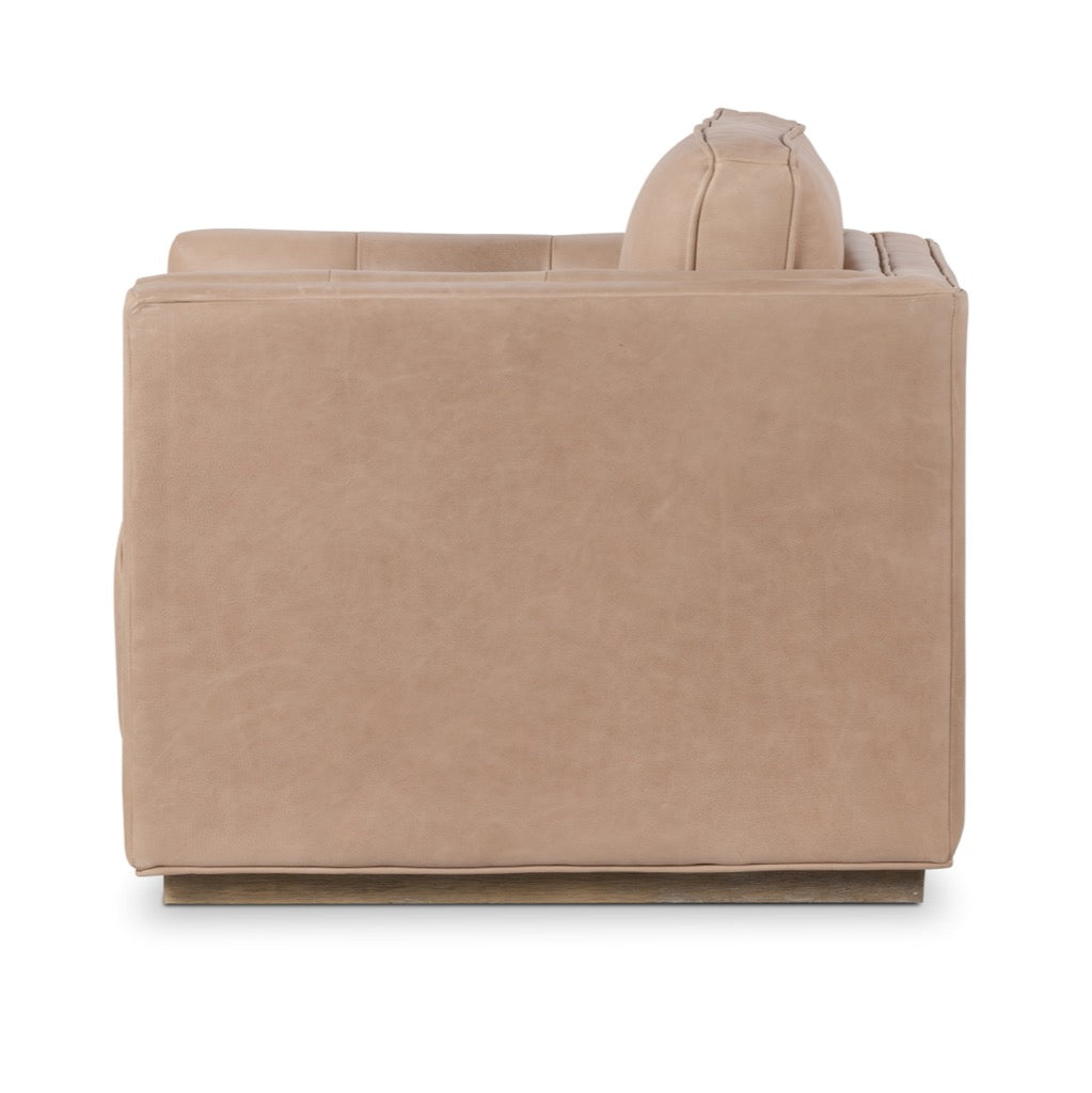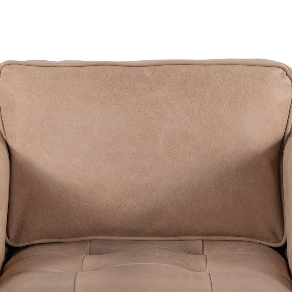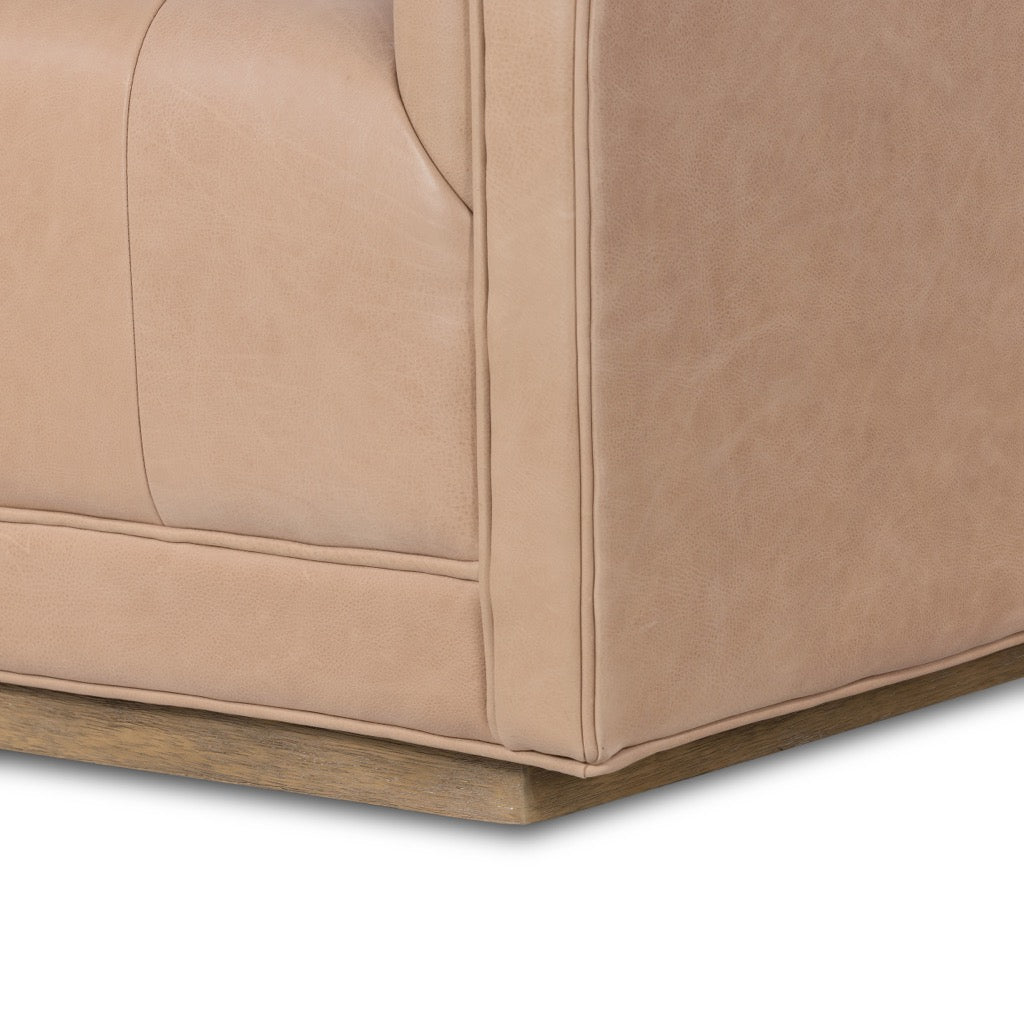 Streamlined shaping enriched by luxurious material. Ivory top-grain leather covers clean-angled arms for a tailored look, while blind tufting delivers an aura of depth. Whitewash parawood swivel base flows effortlessly with a monochromatic vibe.