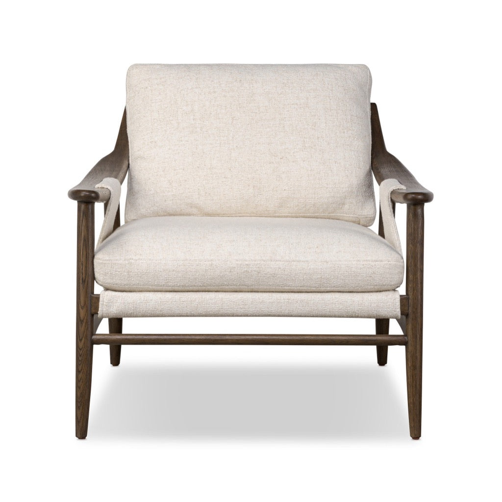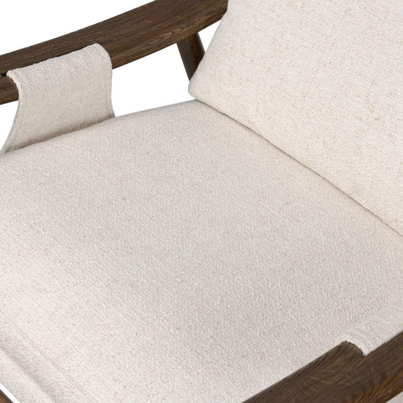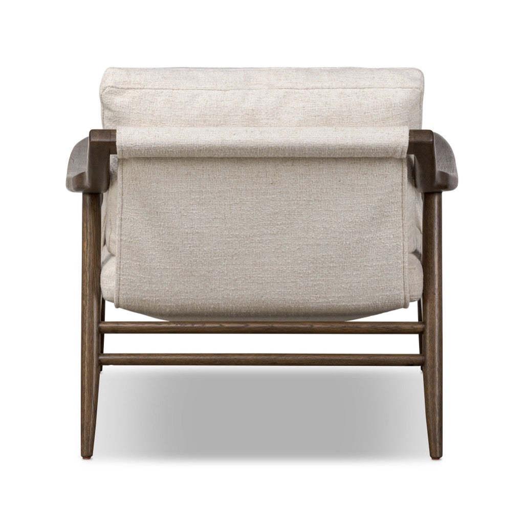 Made with a thick-weave high-performance fabric, a sling-style chair features feather- and fiber-blend cushions for comfort, with clean boxing detailing. Between tapered oak legs, stretchers shape a slight arch, for an intriguing design detail. Performance fabrics are specially created to withstand spills, stains, high traffic and wear, ensuring long-term comfort and unmatched durability.