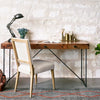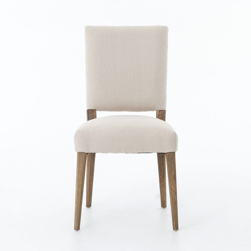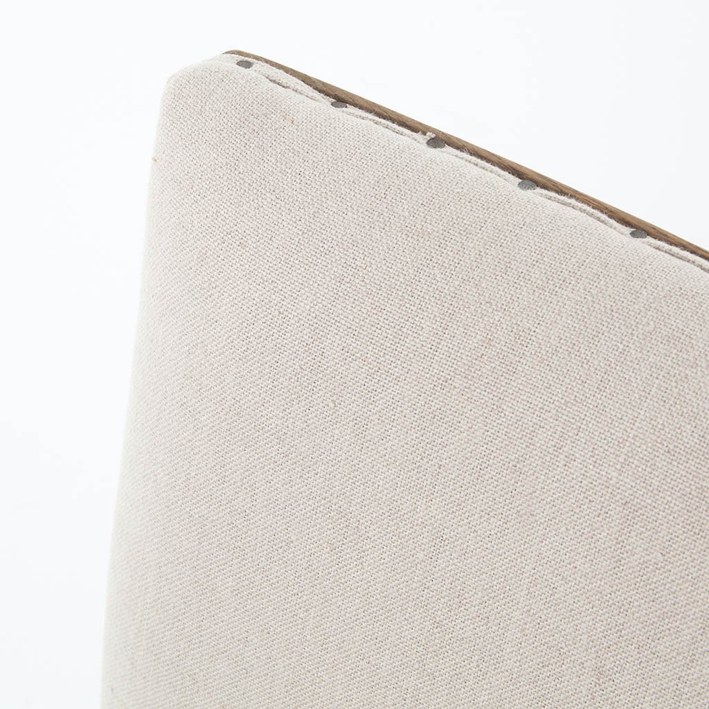 Clean, upright shaping, spit-tack detailing, and an open-framed back bring mid-century inspiration to the table in the form of the Kurt Dining Chair. Square tapered legs of solid oak are weathered to contrast the 100% linen upholstery.