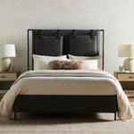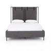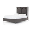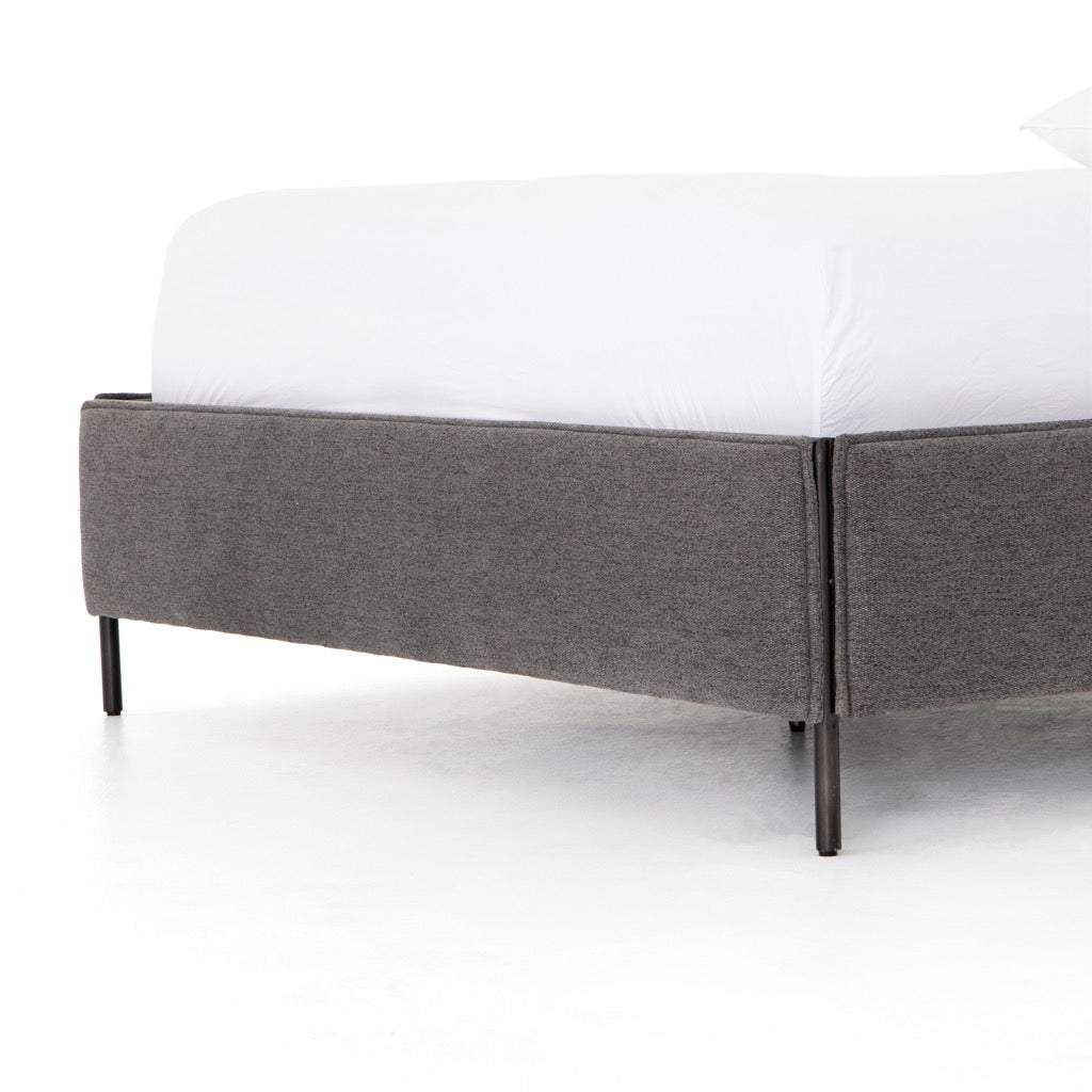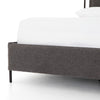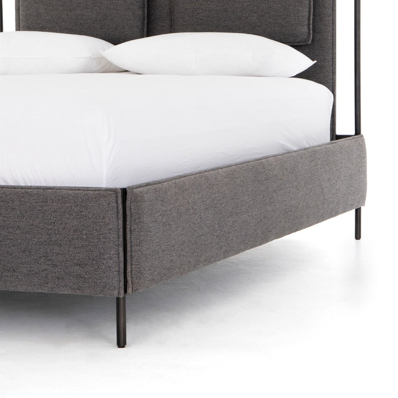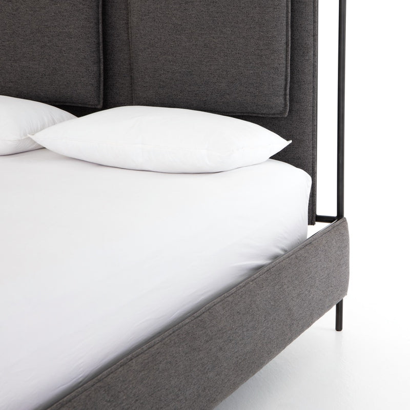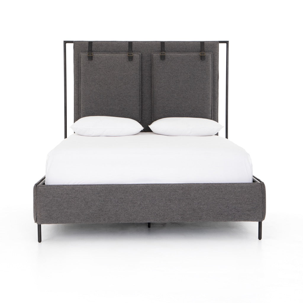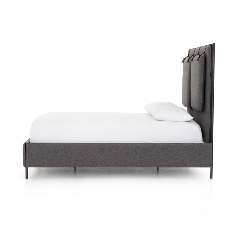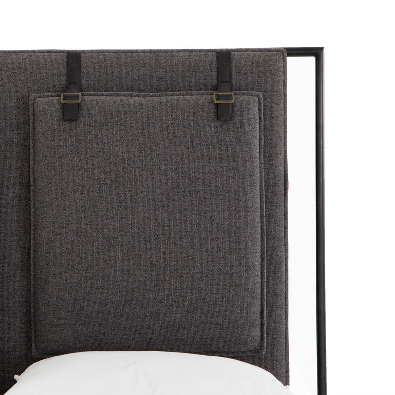 Safari styling gets a modern reboot. Linen-blend upholstery of ash grey lays a texture-rich base for a forward-thinking bedroom look. Black leather straps secure decorative headboard pillows, suspended for eye-catching effect. Box spring required.