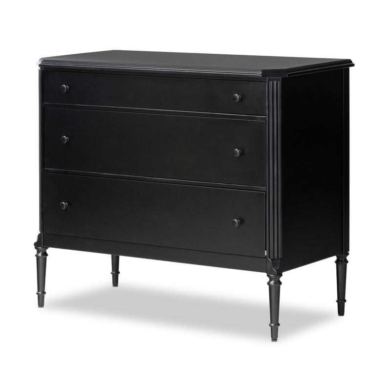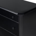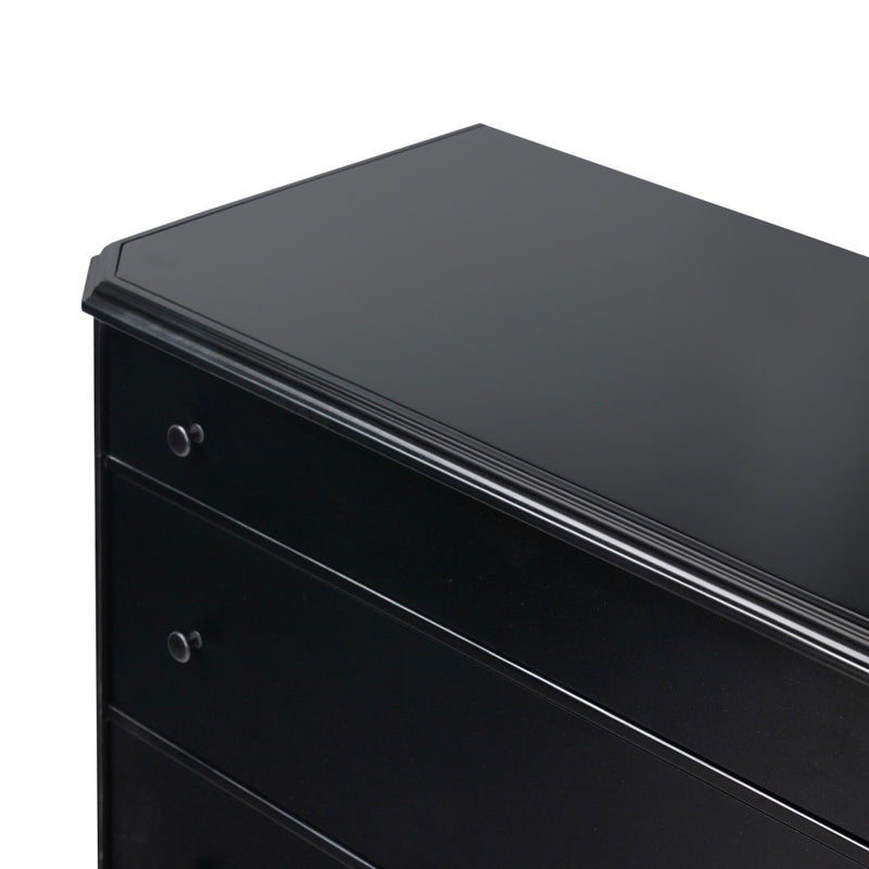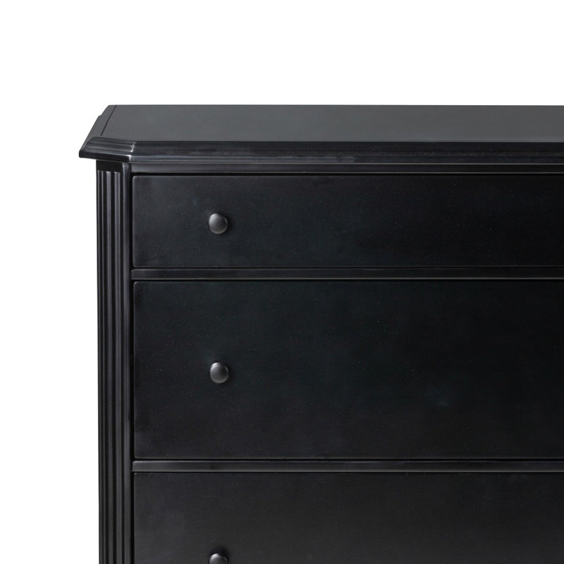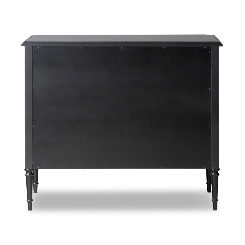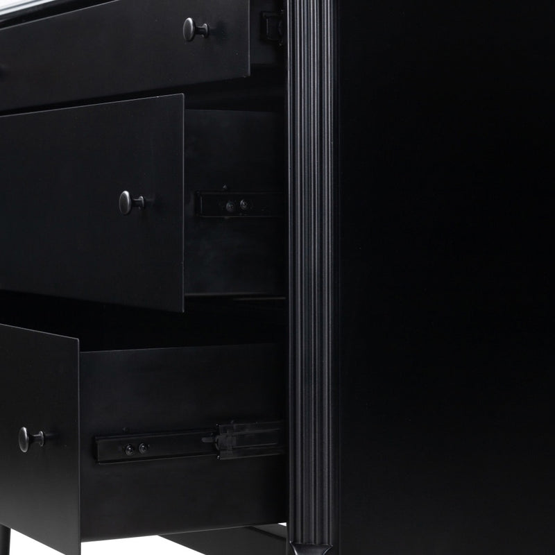 This French-inspired full-on metal dresser features turned leg detailing, classic moulding along the edges and an ogee edging on top. Drawers open and close on smooth side-mount metal glides. Crafted from iron in a matte black. This item complies with the STURDY Act.