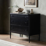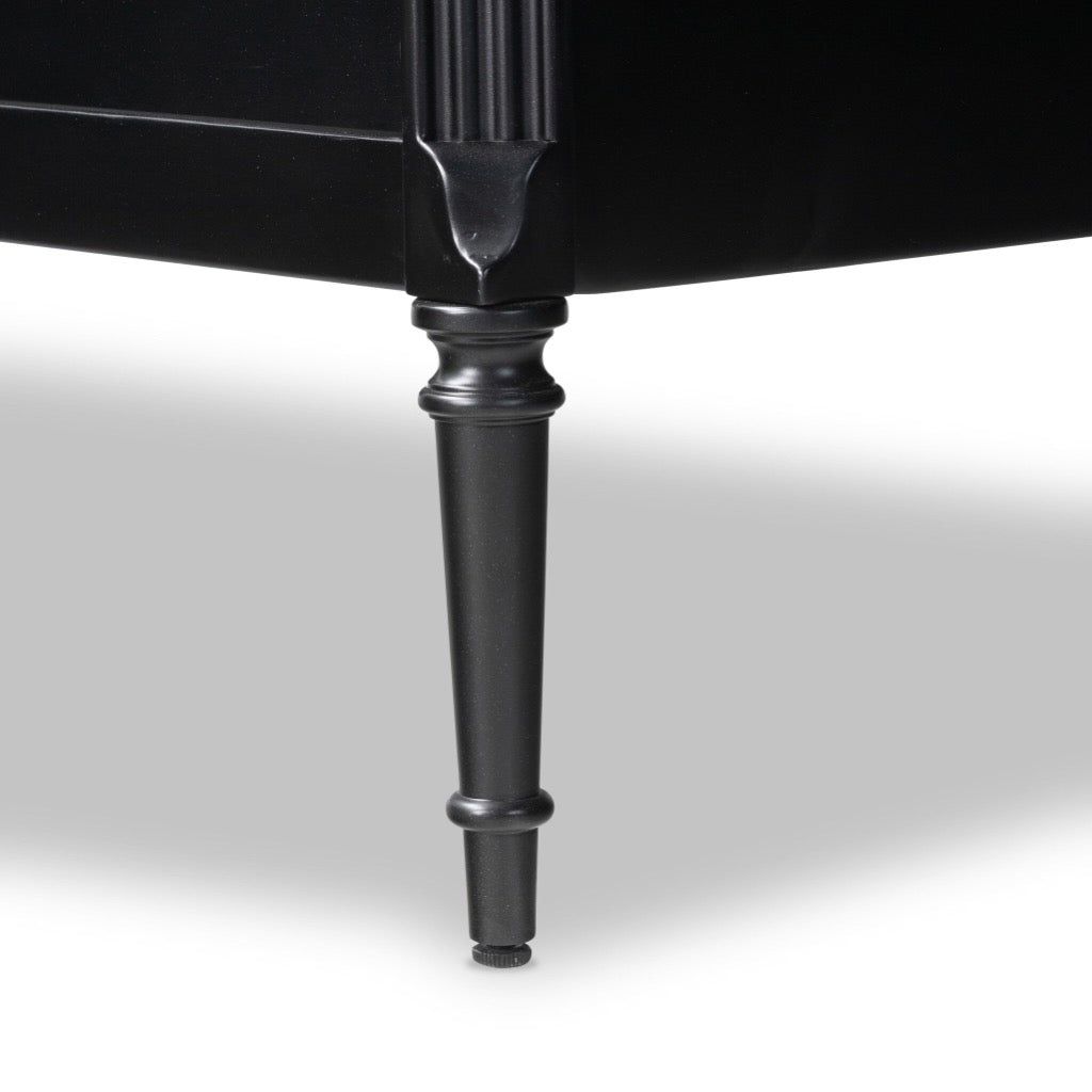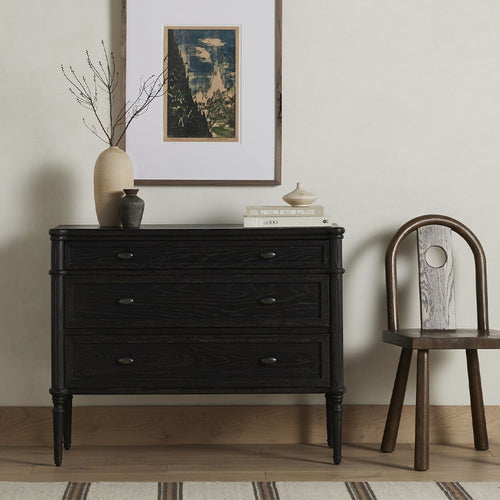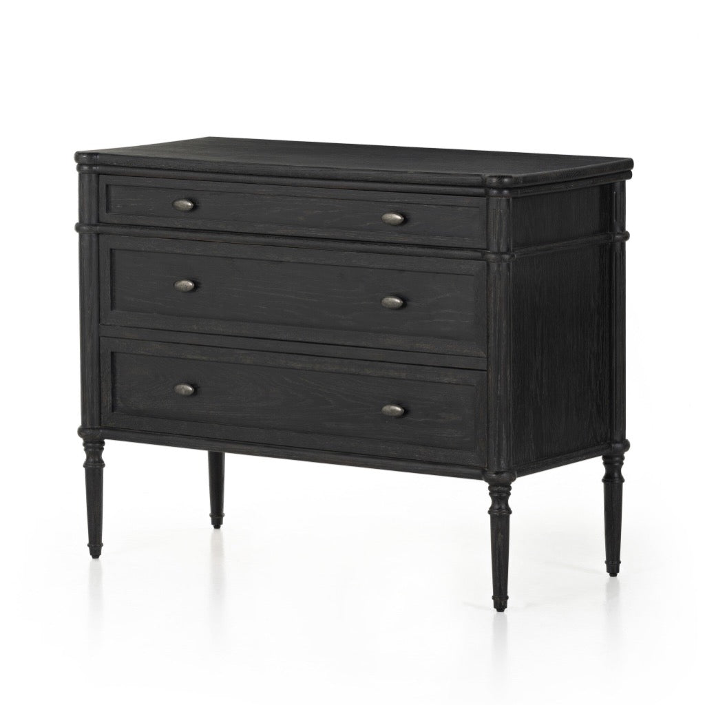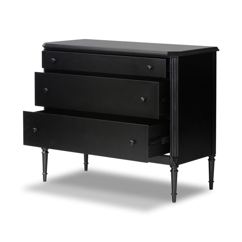 This French-inspired full-on metal dresser features turned leg detailing, classic moulding along the edges and an ogee edging on top. Drawers open and close on smooth side-mount metal glides. Crafted from iron in a matte black. This item complies with the STURDY Act.