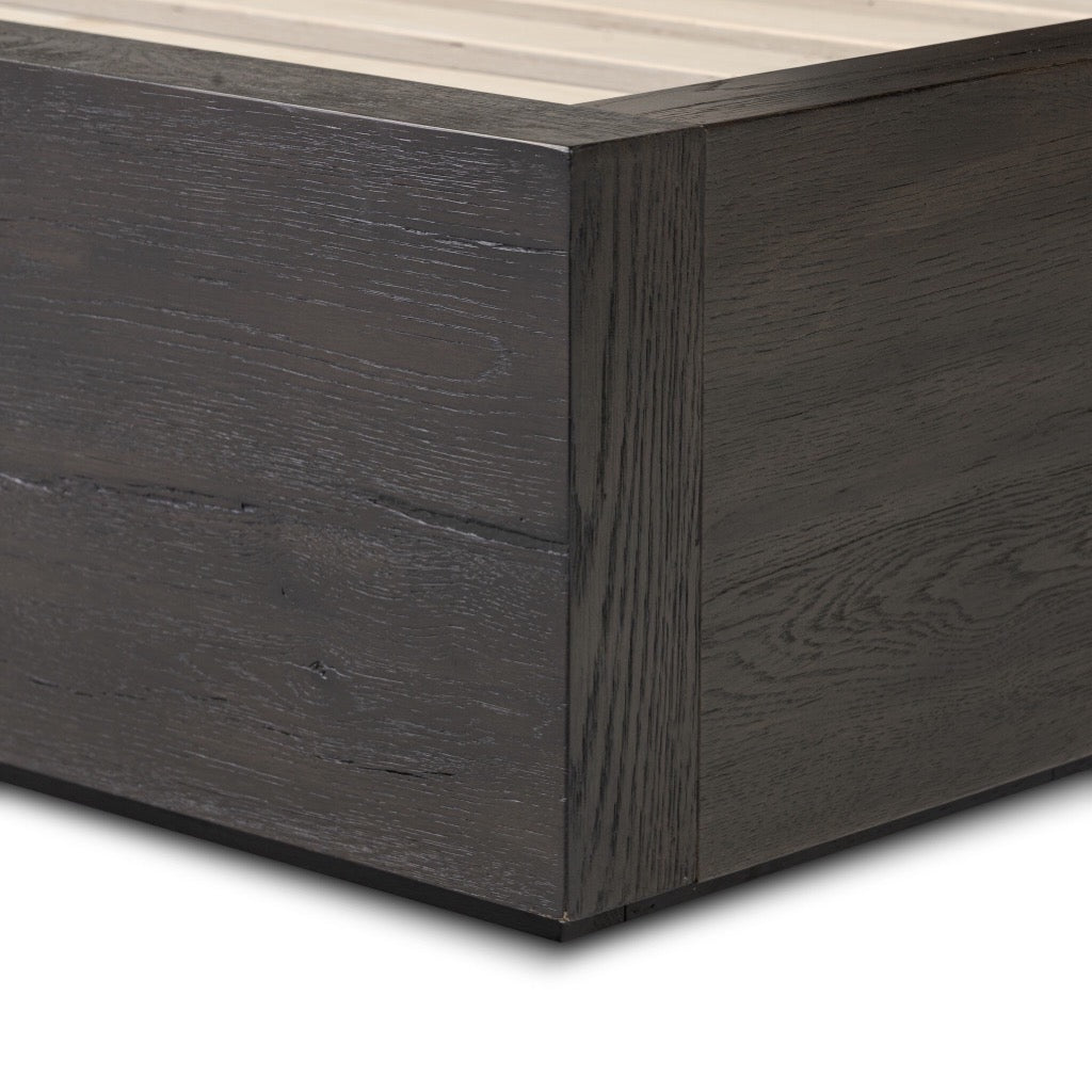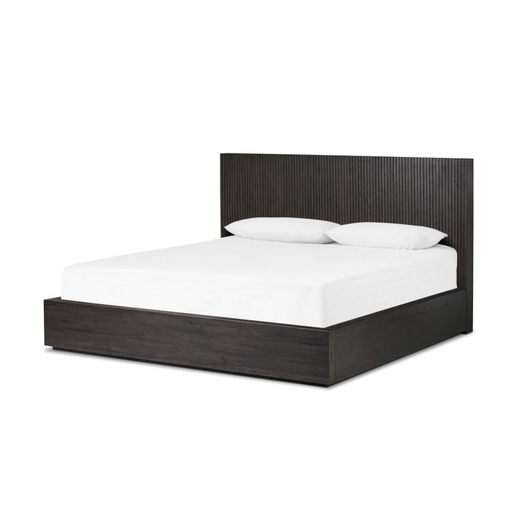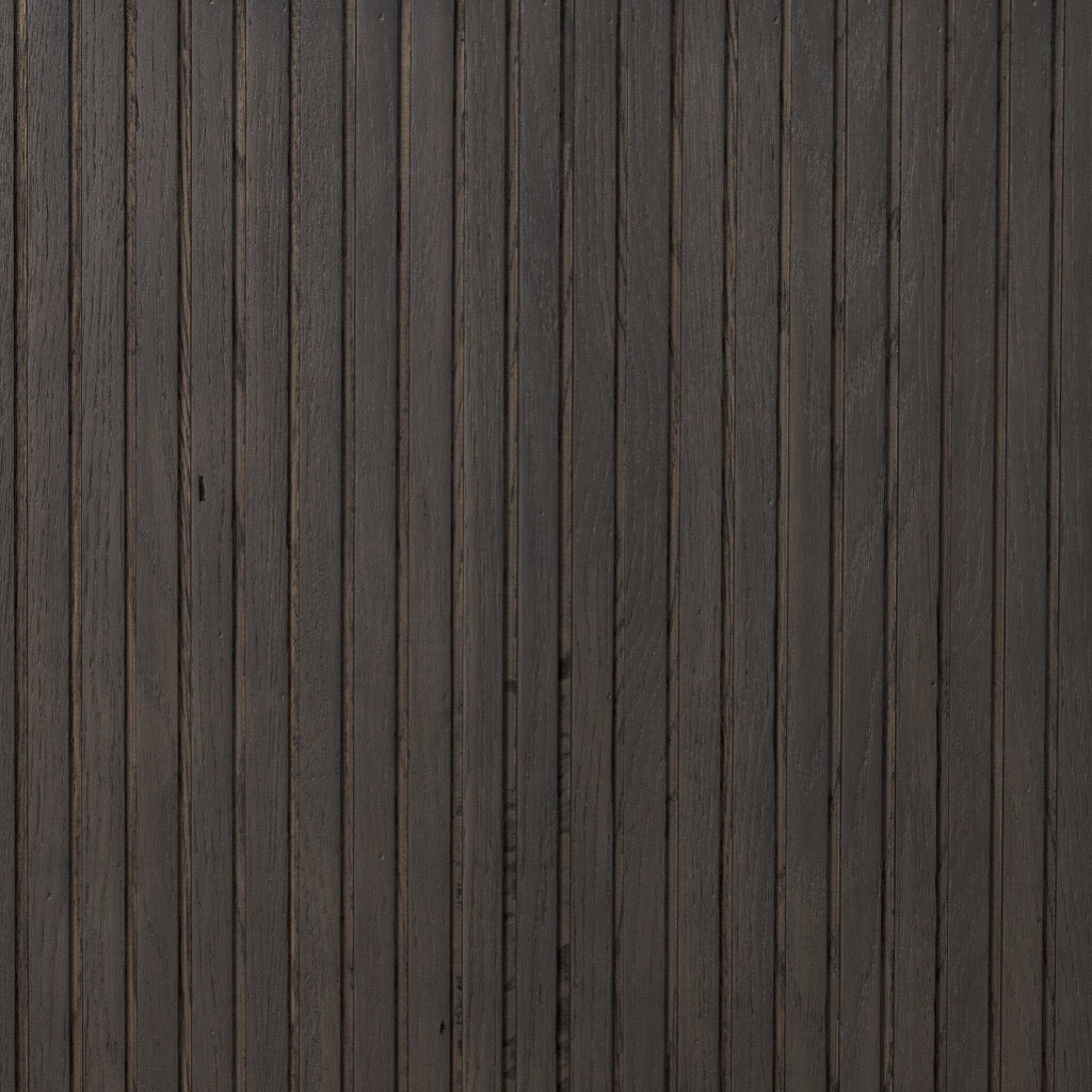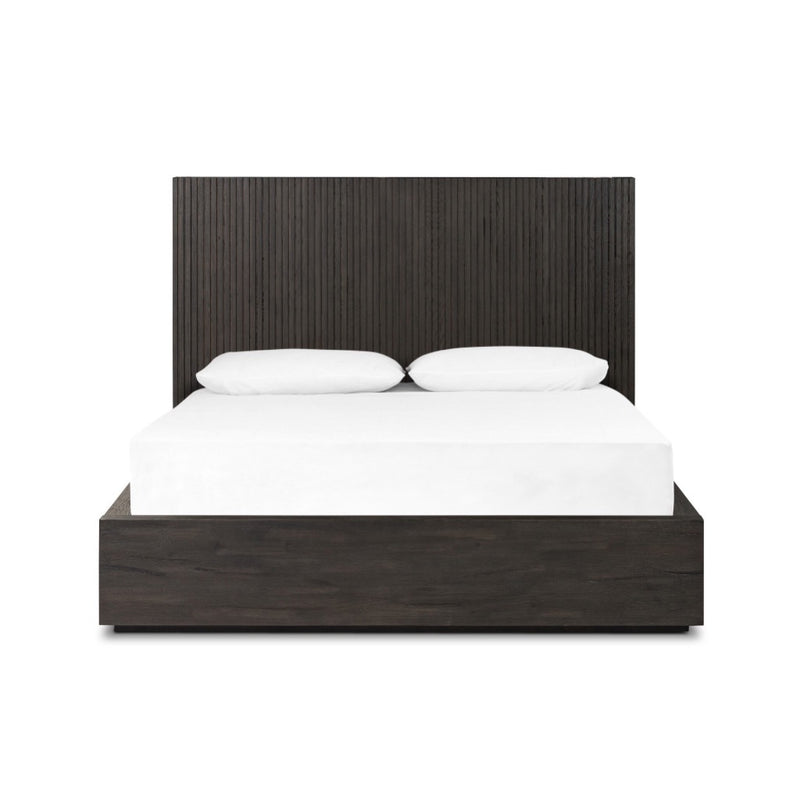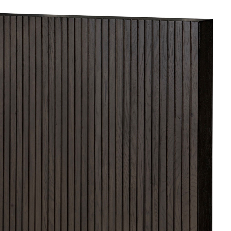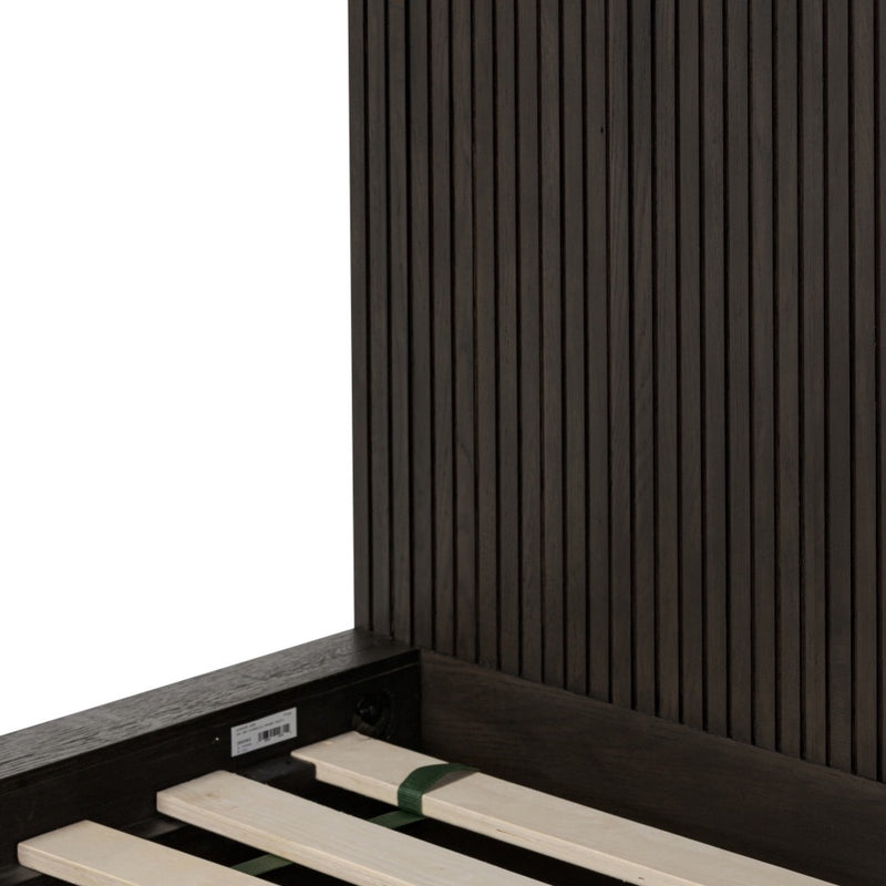 Designed by Thomas Bina and Ronald Sasson, a design partnership blending both modern minimalist and Brazilian influences. Crafted from a mix of solid oak and thick-cut oak veneer, this clean-lined bed features vertical reed detailing on the tall headboard and beautiful horizontal graining on the footboard for extra drama.