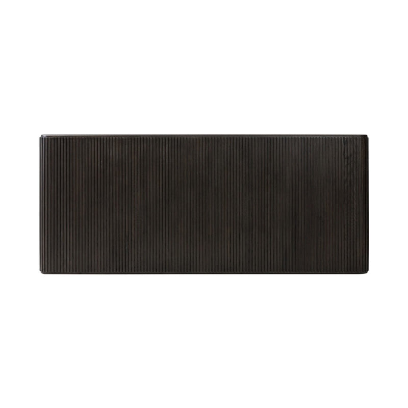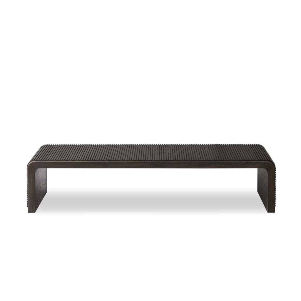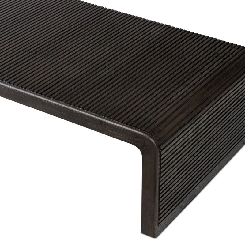 Smoked black oak shapes an elongated coffee table, rich with reeding. Subtly rounded edges reflect Brazilian midcentury inspiration behind this crafted minimalist piece. Designed in partnership with longtime Four Hands collaborator Thomas Bina and designer Ronald Sasson.