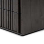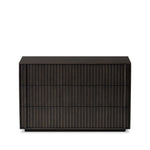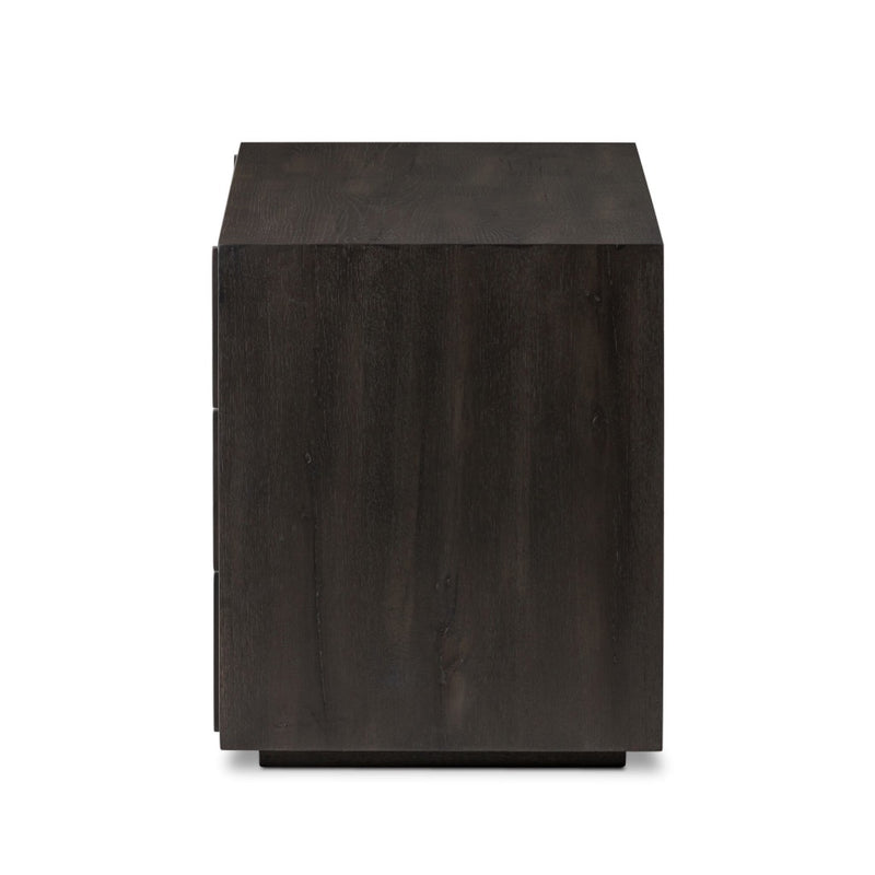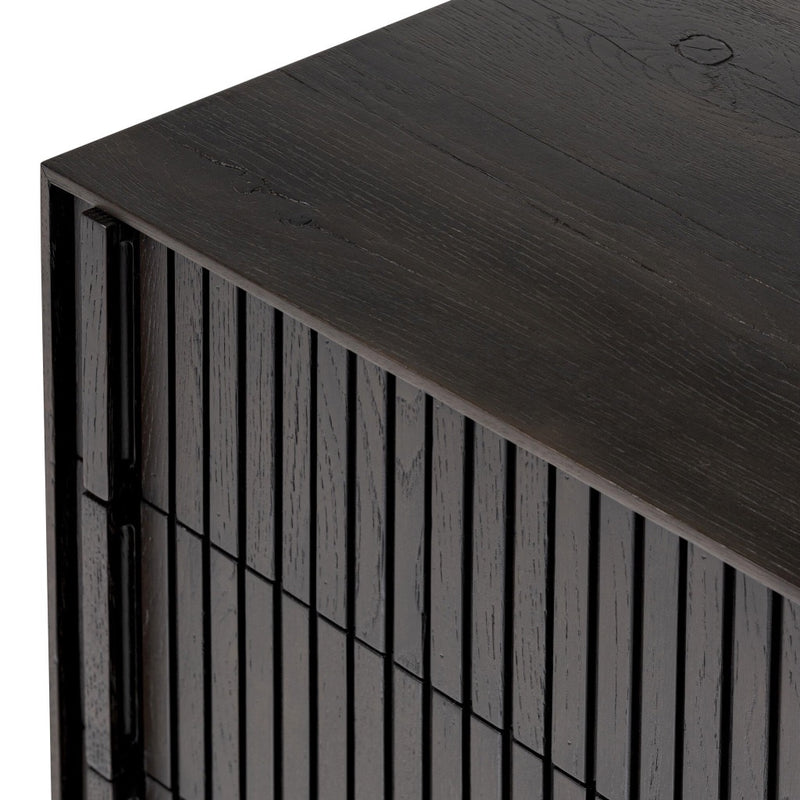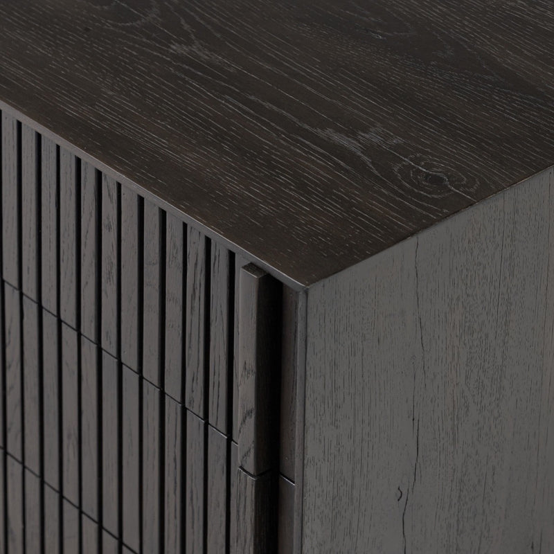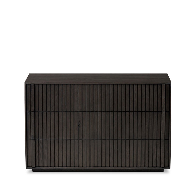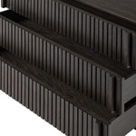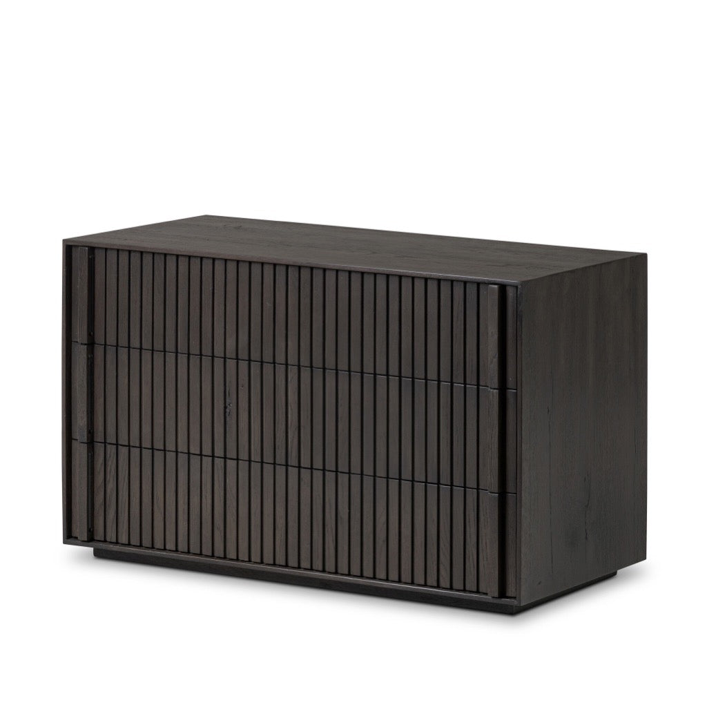 Designed by Thomas Bina and Ronald Sasson, a design partnership blending both modern minimalist and Brazilian influences. Crafted from solid oak, this clean-lined nightstand features vertical reed detailing on the drawer fronts with wooden pull detailing on the outer edges. Drawers are finished with soft close undermount drawer glides.