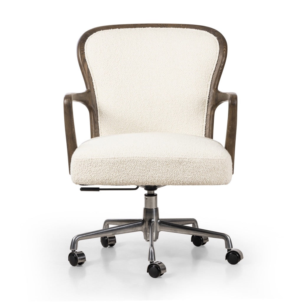 Heritage inspiration meets modern comfort in a desk chair. Soft curves of grey-finished wood frame a seat of textural cream fabric. Height adjustable with a 360-degree swivel base and smooth-rolling casters ensures ease in the workplace.