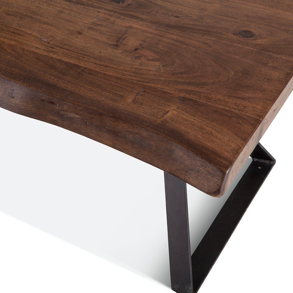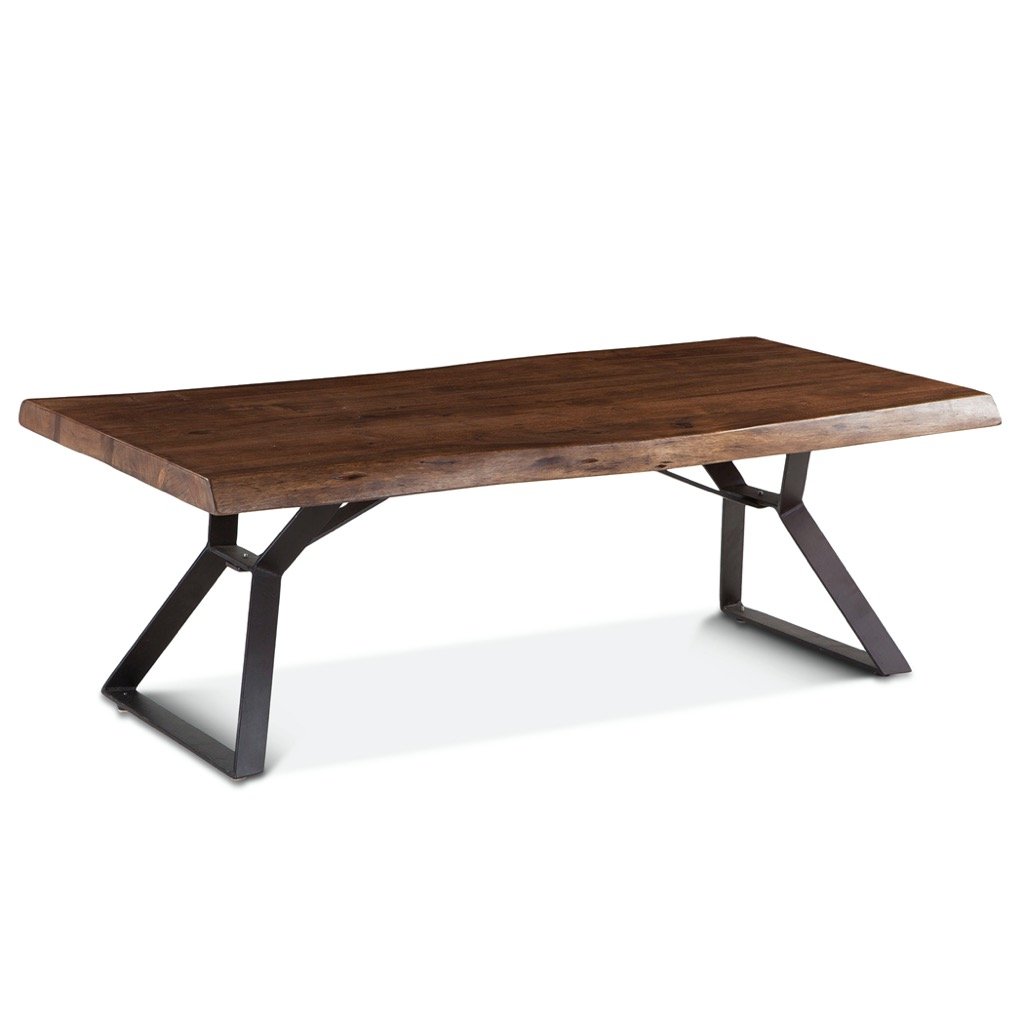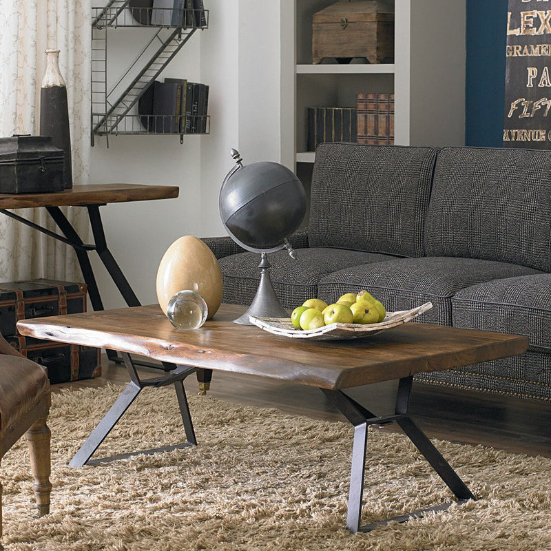 With a classic charm and air of sophistication, this hand-crafted coffee table cut from from a thick Acacia slab sits atop a sleek, hand-forged iron base to create a fusion of natural and industrial elements. The London Loft live edge coffee table's live edge adds to the unique beauty of this collection.