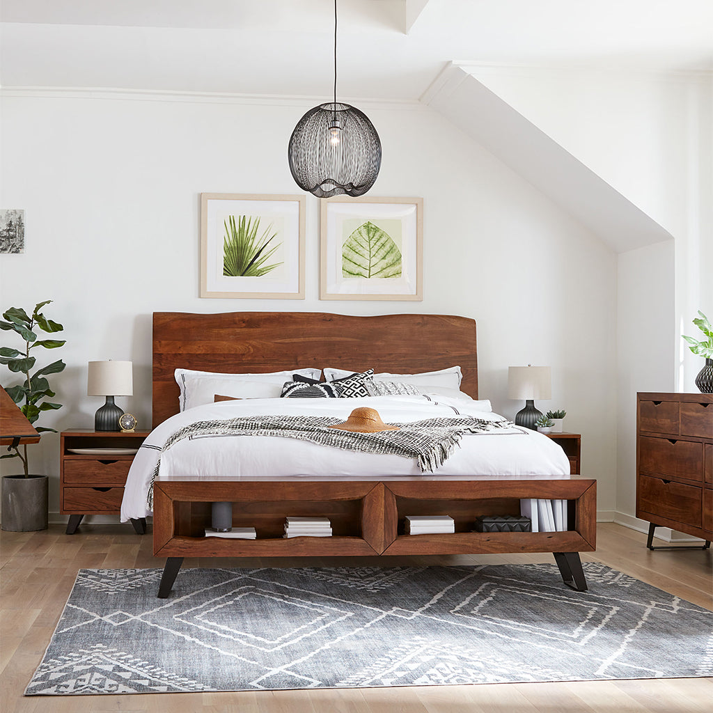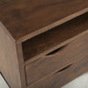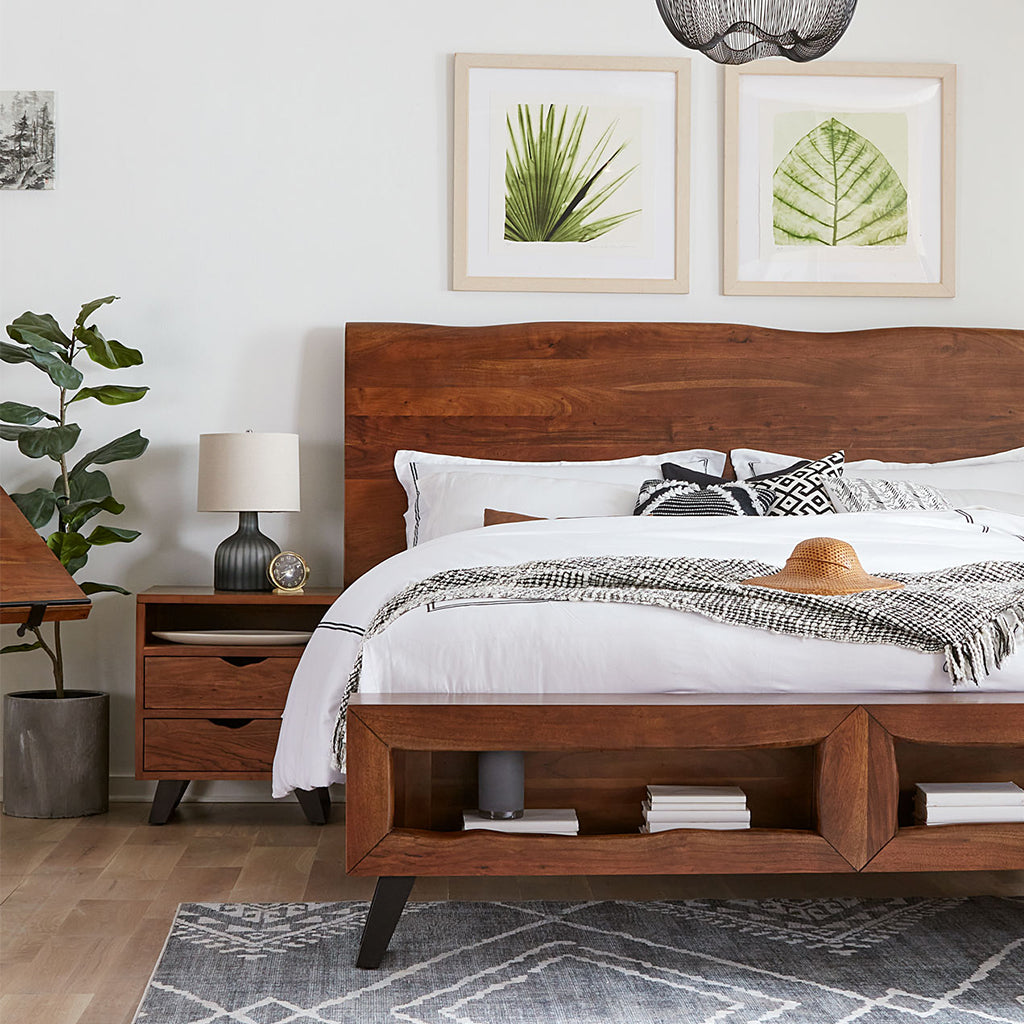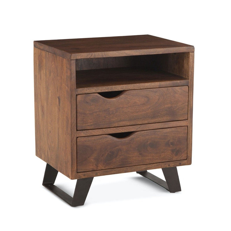 With a classic charm and an air of sophistication, this hand-crafted nightstand is cut from thick Acacia wood slabs that are adorned with its' natural live edge. A sleek metal base creates a fusion of natural and industrial elements. The unique beauty of the London Loft Night Chest has ample storage for all your bedside needs and enough style to sit alone in a room.